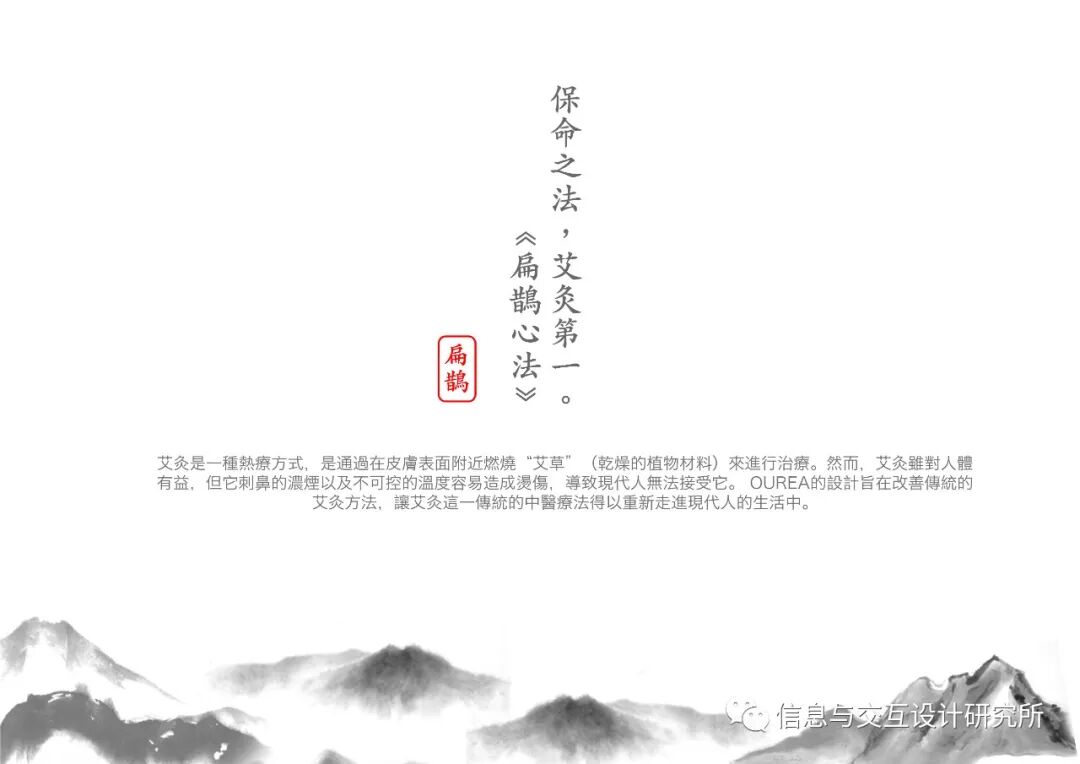 Designby:许倩武 美学生活家居|干泡茶具|传统文化 自然之景永远都属于大自然,它不属于城市更不属于桌面。设计师的创意倾注,将自然之味带到城市生活中,把映衬在清晨的漫山雾气之中的群山梯田隐现置于桌面上。 如同茶杯袅袅升起的茶香化作雾气,起伏的山纹如同乐章,仿佛与知己好友置身自然之中共享茶之乐趣,感受大自然的美妙旋律; 把大自然切割置于鹅卵石之上,是为以小见大,以此探寻纯真的趣味,静下心来品茶之余,忆往童年河边拾取鹅卵石的快乐时光,感受纯真、自然与美好。 02 OUREA家用智能艾灸器 Designer: Echo 家用医疗|智能设备|传统文化 艾灸是一种热疗方式,通过在皮肤表面附近燃烧“艾草”来进行治疗。艾灸虽对人体有益,但它刺鼻的浓烟以及不可控的温度,导致现代人无法接受。 OUREA旨在改善传统的艾灸方法,使用过程无烟无火,避免烫伤及引发火灾的风险,使艾灸更安全。并运用医用艾草贴片使OUREA可自行固定于目标穴位,让用户解放双手,在家便可享受艾灸。 03 Designer: Seungkyun Kim 自然设计|家居设计|智能产品 生活压力大的年轻人,一直在找寻心灵归宿的路上前进。亲近自然,从古至今一直是人们舒压解郁的方式,将自然韵味融入产品走进生活,既可以为原本程式化的空间增添温馨指数也可以让心情变得愉悦。