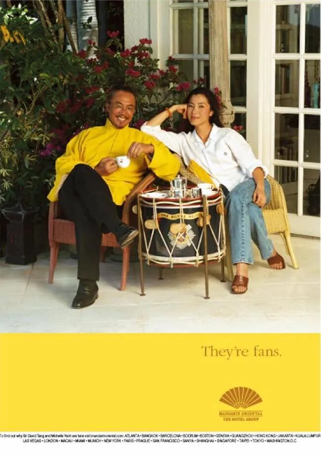 这一提议很快得到了杨紫琼的全情响应,2000年,文华东方酒店粉丝广告系列的头组广告,在邓永锵爵士位于香港西贡的私邸开拍,掌镜的是英国皇室御用摄影大师Patrick Litchfield勋爵,出镜的是最早响应文华东方粉丝系列广告号召的邓永锵和杨紫琼。