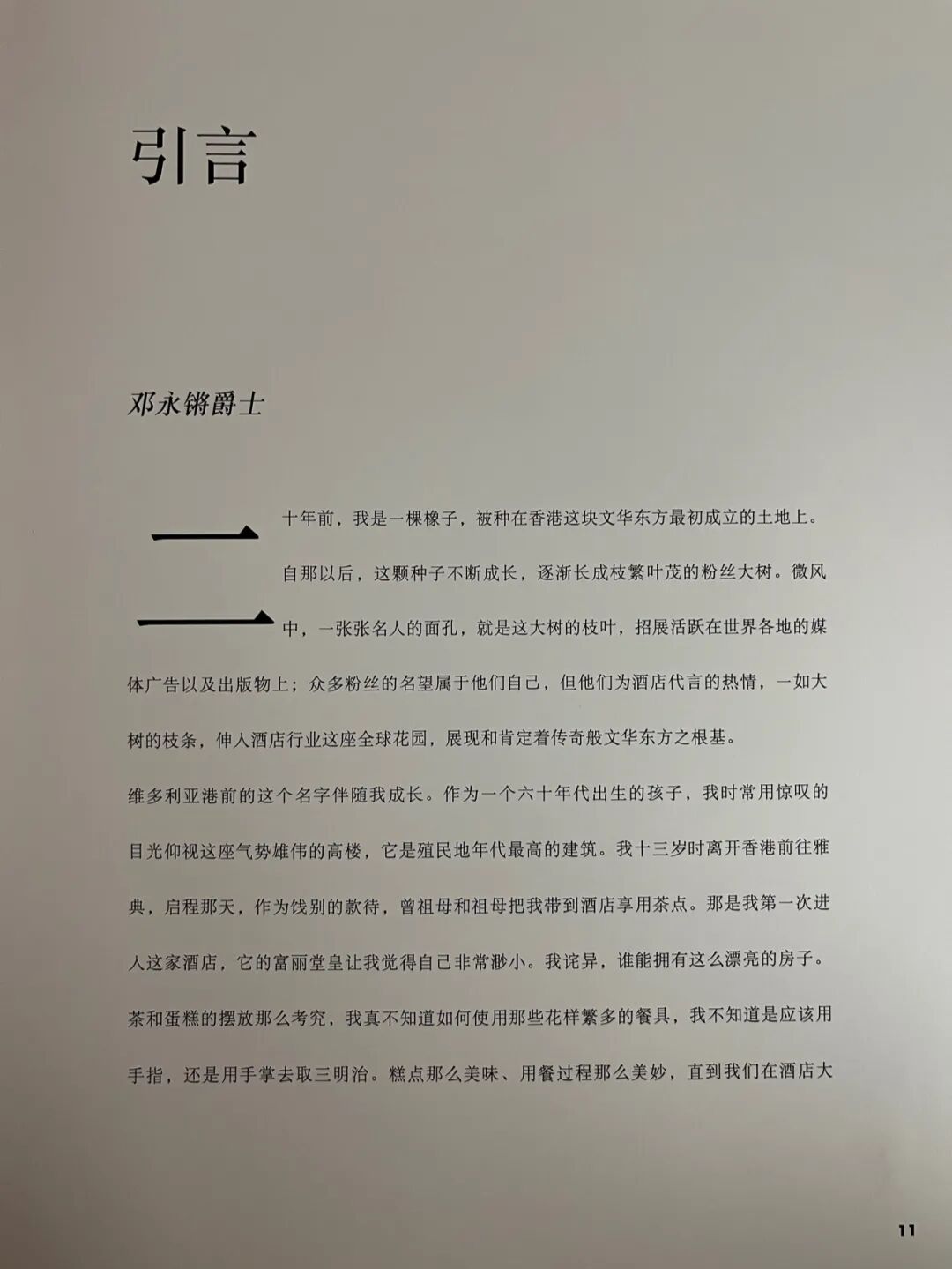 我收集了无数的酒店读本,其中很多要么是纯图册,要么是读起来很柴的历史教科书,文华东方的这本难能可贵地做到了好读、好看也有干货。而邓永锵所作的触动人心、让人热泪盈眶的引言(下图),更是全然升华了整本书,也点亮了文华东方这个酒店品牌。