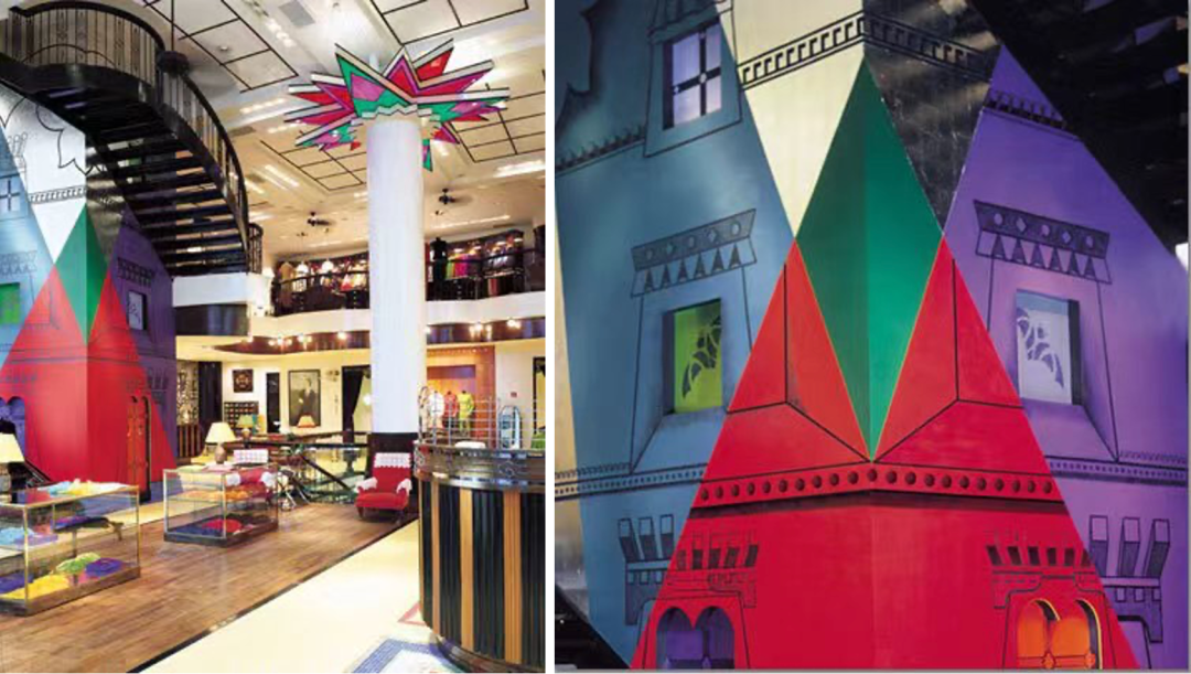▲ 1997年启幕的纽约麦迪逊大道上海滩门店中,墙绘艺术家Elizabeth Thompson在高耸的墙头呈现出中国西藏寺庙建筑的形象。壁画融入上海滩常用的霓虹粉、柠檬黄等色彩,也是邓爵士在游历西藏时所受的启发。