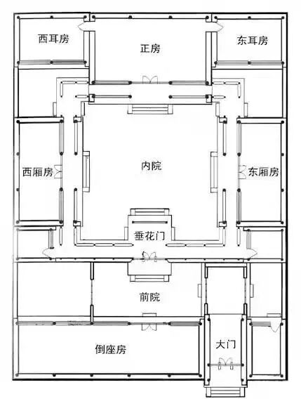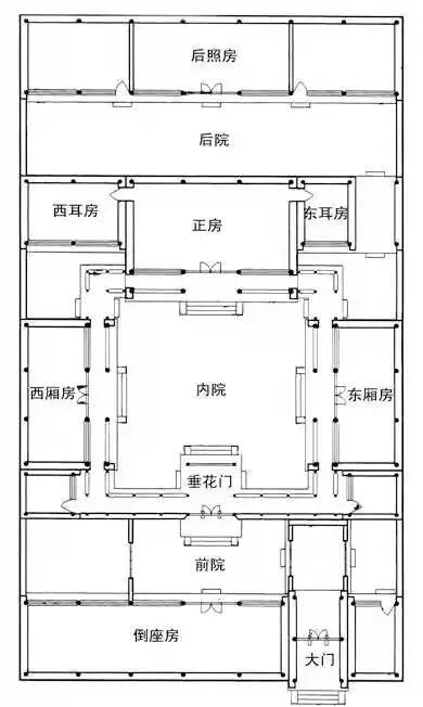 一般而言,一进院落为北房为正房,东西为厢房,南为倒座房的布局;两进院落分前后院,前院由门楼、倒座坊组成,前后院相连的门一般称作垂花门;三进院中的第一进院是垂花门之前由倒座房所居的窄院,入门后为由正房、厢房和游廊组成的第二进院落,第三进院为正房的后罩房。四、五进院的布局方式多种多样,但总体为“前堂后寝”式。