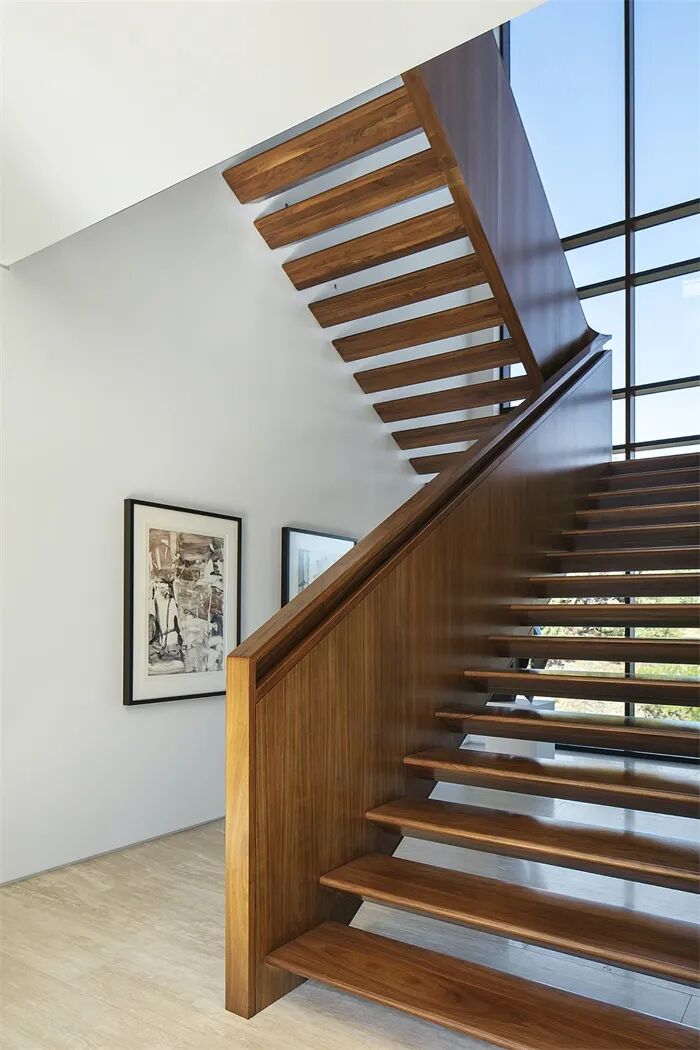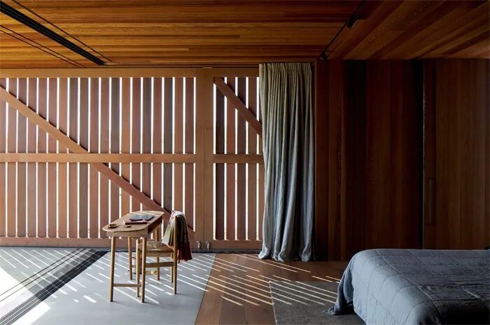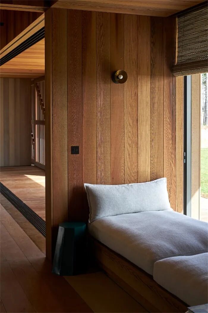 三层空间布局中,在主楼梯两侧呈对称状,占据了垂直板条非洲木包裹的中央空间。主人套房落地玻璃,填充了东部的长水平空间,并包裹着非洲风情。其他卧室占据了西侧垂直空间,外侧面覆盖着石灰石,向车库所在的南侧延伸。