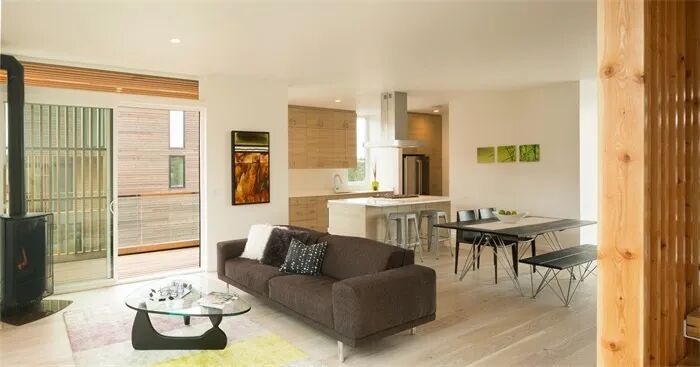 项目涵盖8栋优雅、符合人类尺度的城市住宅,充分利用了周边的美景。天然材料和低对比度采光技术,使得人在室内享有室外一般的感受。宽敞的窗户、白墙和温暖的木质饰面使得起居空间比实际面积感觉更大。