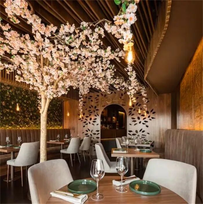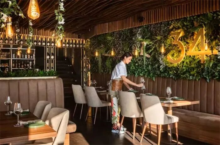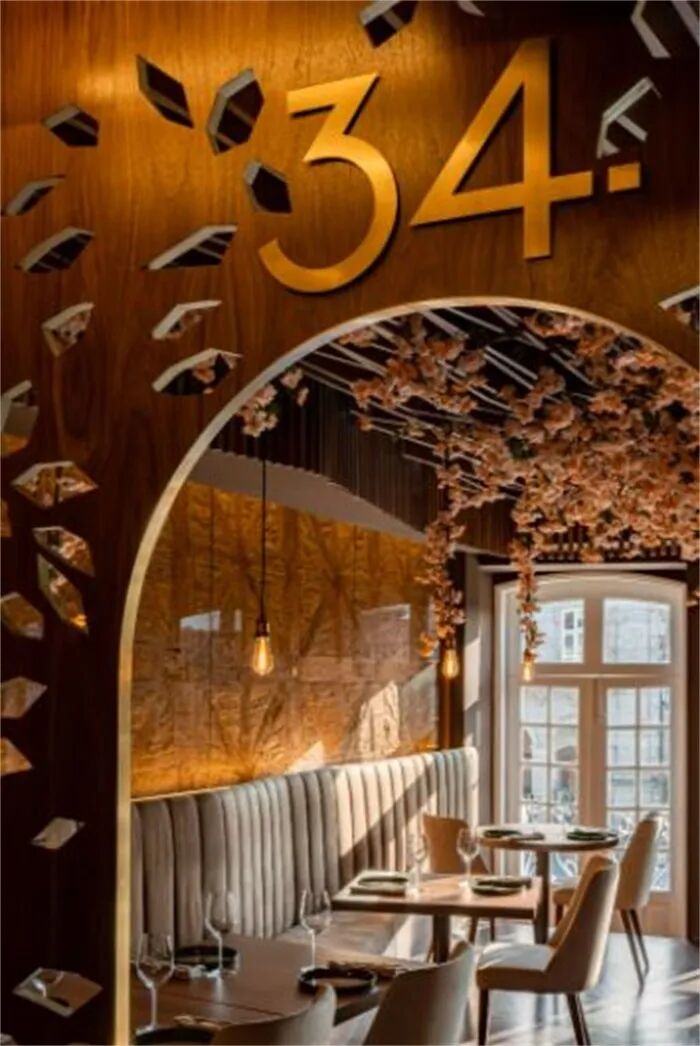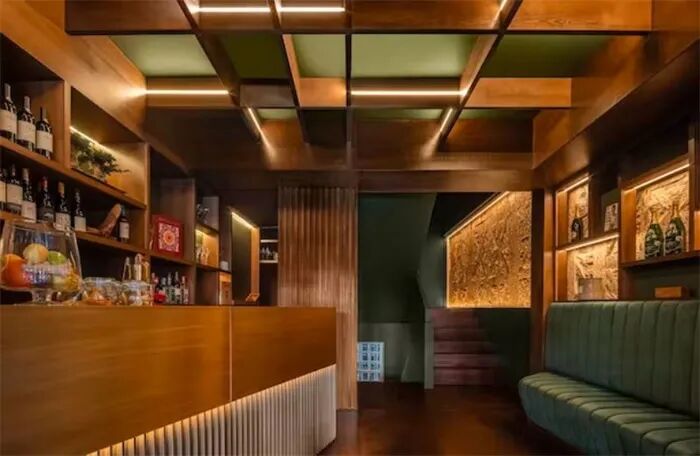 空间呈现出流动性,不规则感被淡化。这些元素中,设计师探索了品牌标识和建筑标识之间的双重性:一方面,建筑的原始砌体得到保留;另一方面,创造了全新的绿色元素和品牌标识。木质天花板由饰条构成,旨在重现老餐厅氛围,赋予空间纵深感,让灯光吊架根据桌子的位置略微移动。