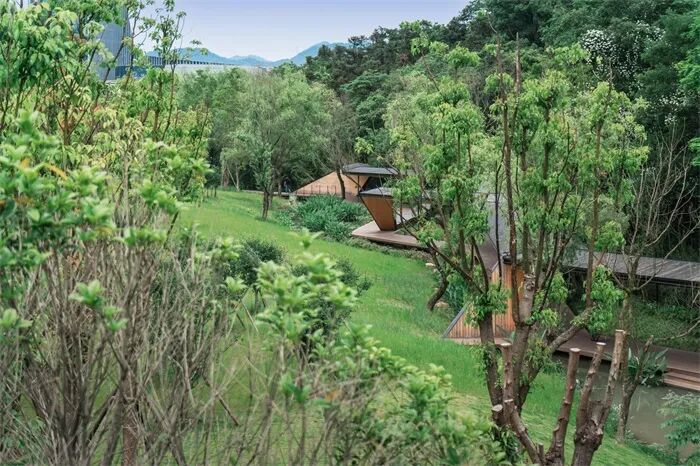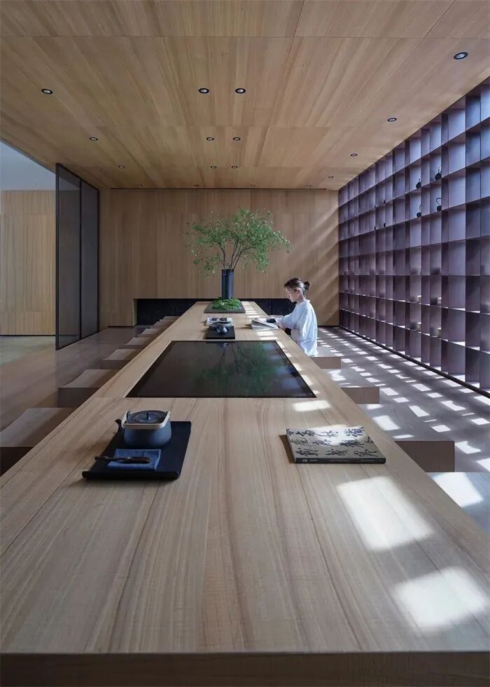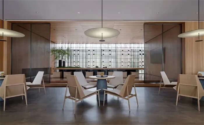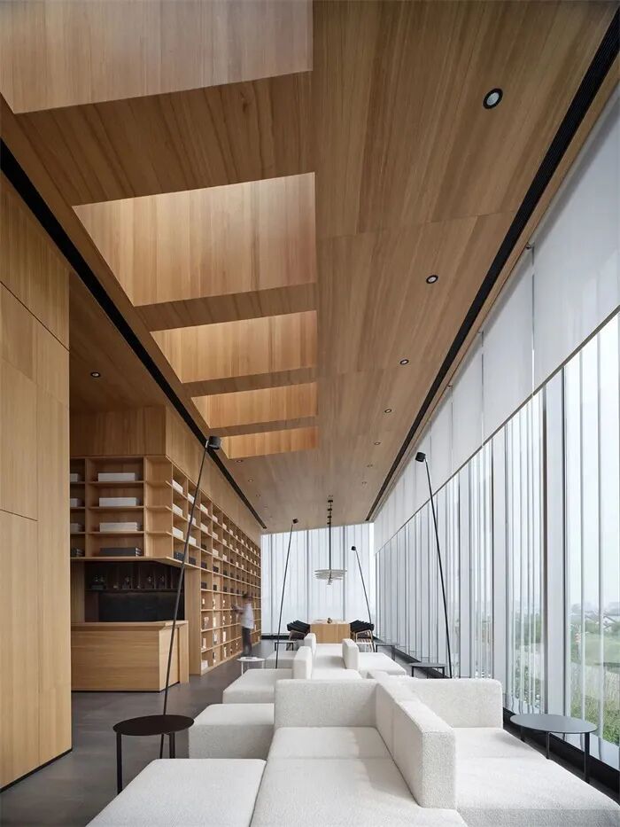 设计师设计的生活艺术休闲廊是项目商业街中的三层建筑。室内空间以幸福为理念,借鉴了汉代的深厚文化和周围山水的魅力。以现代手法传达东方人与自然合一的理念。空间的结构强调了中国传统的仪式秩序概念,这是通过元素有节奏的分层推进来完成的,从而在每一步都为游客呈现不同的视角。少即是多的概念也是一个关键组成部分。空间设计与自然的整体主题一致,具有简约、宁静、纯洁和优雅的感觉。