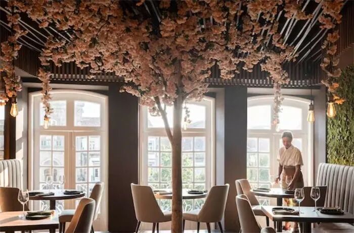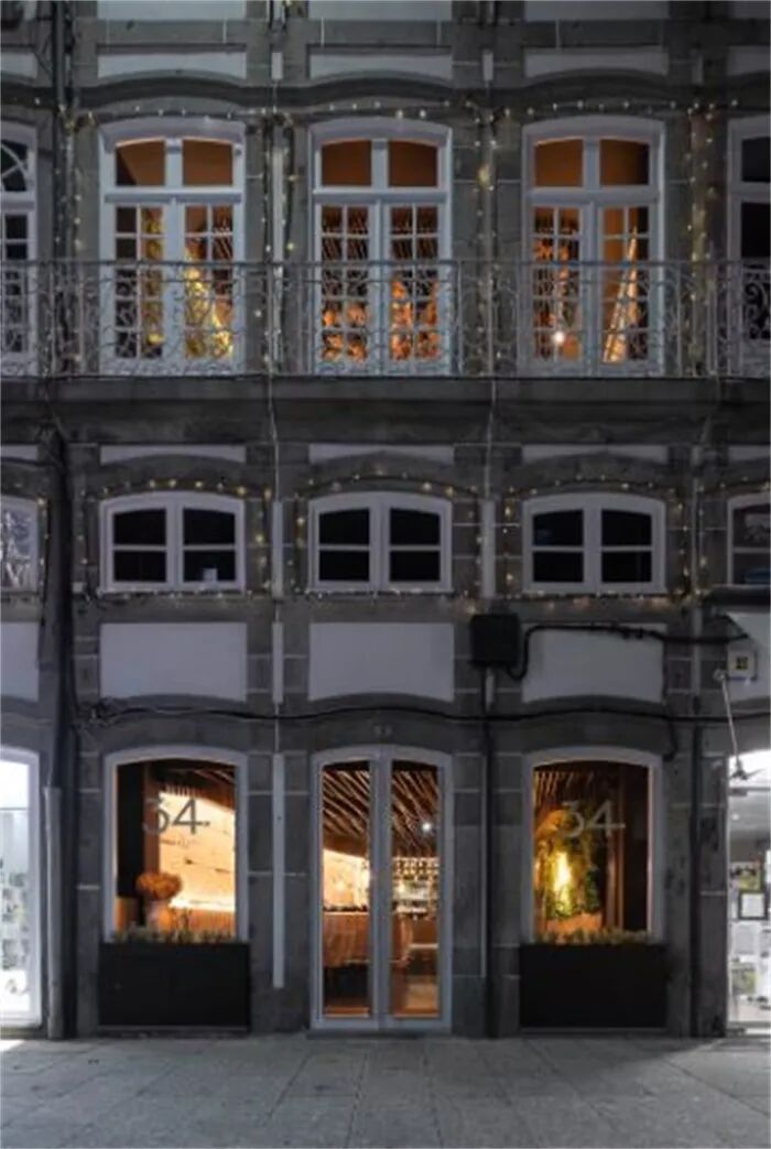 新餐厅空间位于吉马良斯市老城中心,特点是典型的中世纪地块,以不规则的几何结构定义了建筑,并逐渐缩小到天井。考虑到空间特征,设计师决定在地板和天花板上,通过长沙发和平行天花板饰条,用元素勾勒出空间轮廓,并嵌入机电设施。