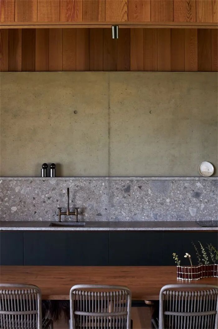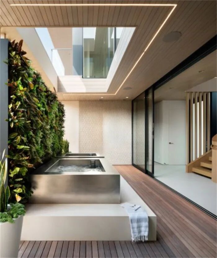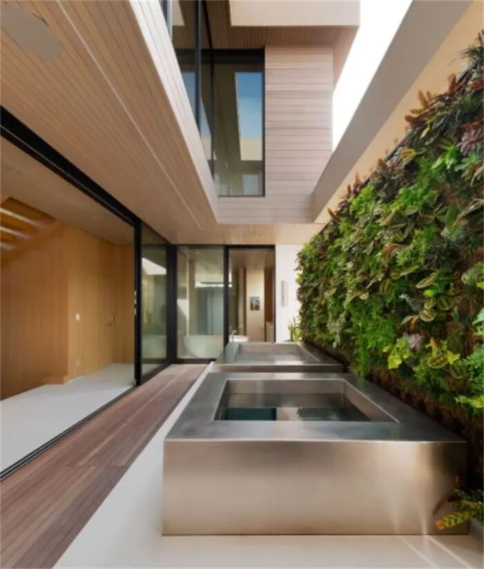 与材料形成对照,花园庭院和水疗中心在住宅中心地带增添了亲近自然的体验。隐蔽的空间与郁郁葱葱的植被和坚硬的钢铁形成对比,提升了当地工艺的完整性,营造了自然的清新触感,打造出致力于健康、艺术和真实性的生活方式的家园。
