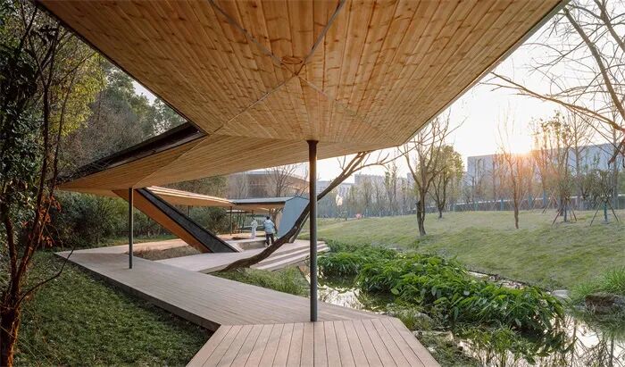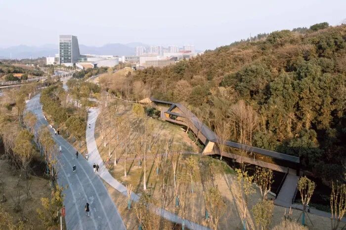“溪上飞檐”所在的浙江音乐学院,是中国第 10 所独立设置的专业音乐教育高等院校。在十年前的设计竞赛之时,基于对当下常规的被围墙所包围的封闭式式高校格局的反思,主创建筑师朱培栋即尝试以“开放的音乐艺术公园”为空间场景的原型,并以“流动地景、隐山乐居”——这一地景化和聚落化的形式操作来跳脱传统的大学校园尺度和界面,寻求一种更具自由性和开放度的艺术院校建设新模式。