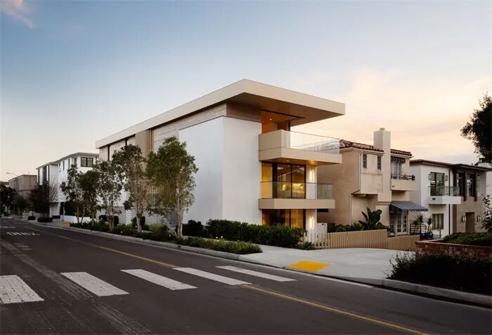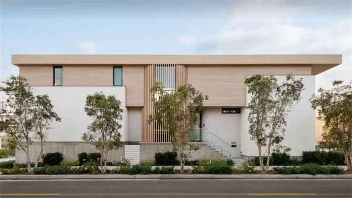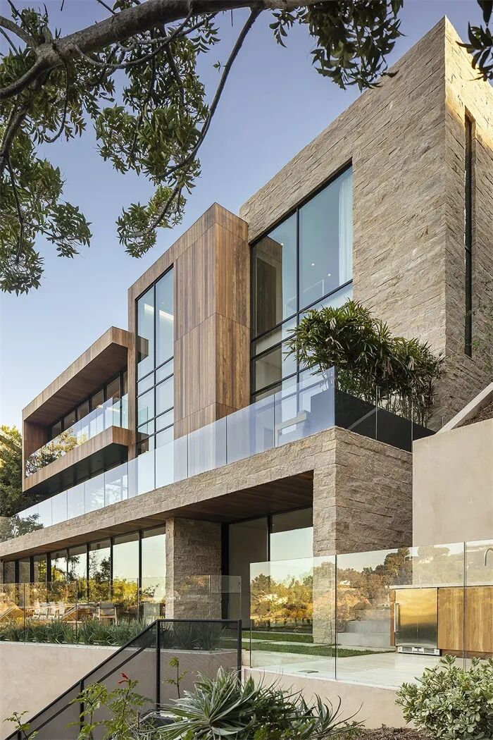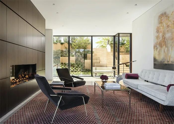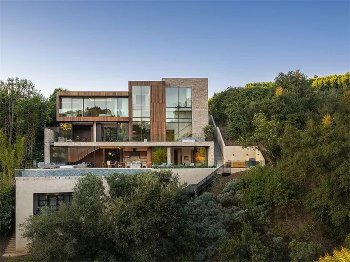 San Remo住宅坐落在加州帕里赛德沙利文峡谷陡峭的山坡上,向北排列成一列,盖蒂山全景视野尽收眼底。房屋由两个石灰岩基座上的垂直、水平体量组成。在峡谷中茂密丛生的原生植物群中,木材和钢铁的垂直线条勾勒出住宅建筑的轮廓。