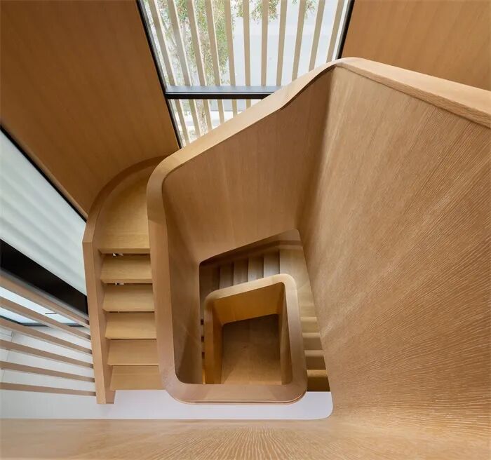 项目设计致力于这样的理念:在手工工艺的艺术表达中表现美。设计师进行了严格的材料研究,同当地工匠密切合作,以实现最终的设计。协作呈现的永恒品质,在带状楼梯和外立面的倾斜灰泥墙中最为明显。为了实现楼梯的曲线和立面的精确线条,匠人们将木材和灰泥层打磨、弯曲并层压。