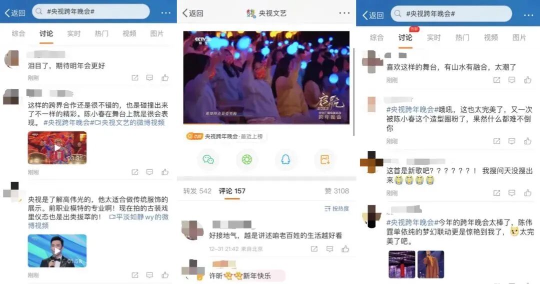 本次央视跨年晚会收视、热度、口碑全面开花。根据CSM数据,央视跨年晚会收视亮眼,获得当晚各大跨年晚会全国网收视第一,全国网平均收视份额5.75%,同比上涨22%。晚会开播后迅速冲上热搜,网友评论中“震撼”“感动”“治愈”等关键词频现,好评如潮。截至1月2日,《启航2023——中央广播电视总台跨年晚会》斩获全网热搜139个,话题阅读总量超22亿,相关视频全网播放量超2.5亿。主话题#央视跨年晚会#阅读量超5.6亿,#央视跨年晚会节目剧透#、#2023央视跨年晚会官宣#、#央视跨年晚会预告#等霸榜全网热搜,相关话题热度持续延伸,多次登顶榜首。