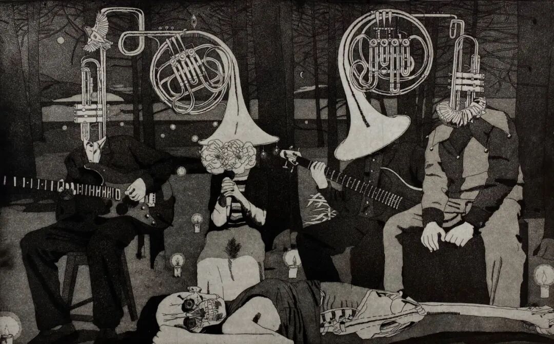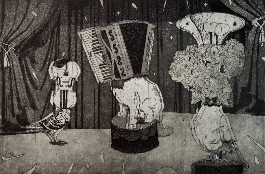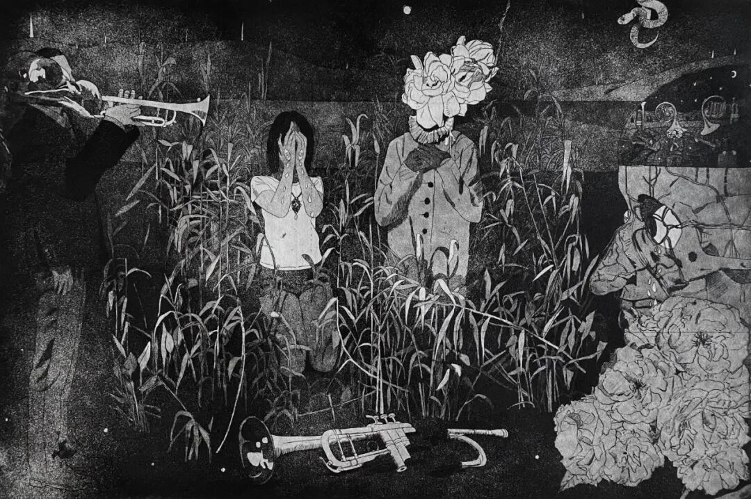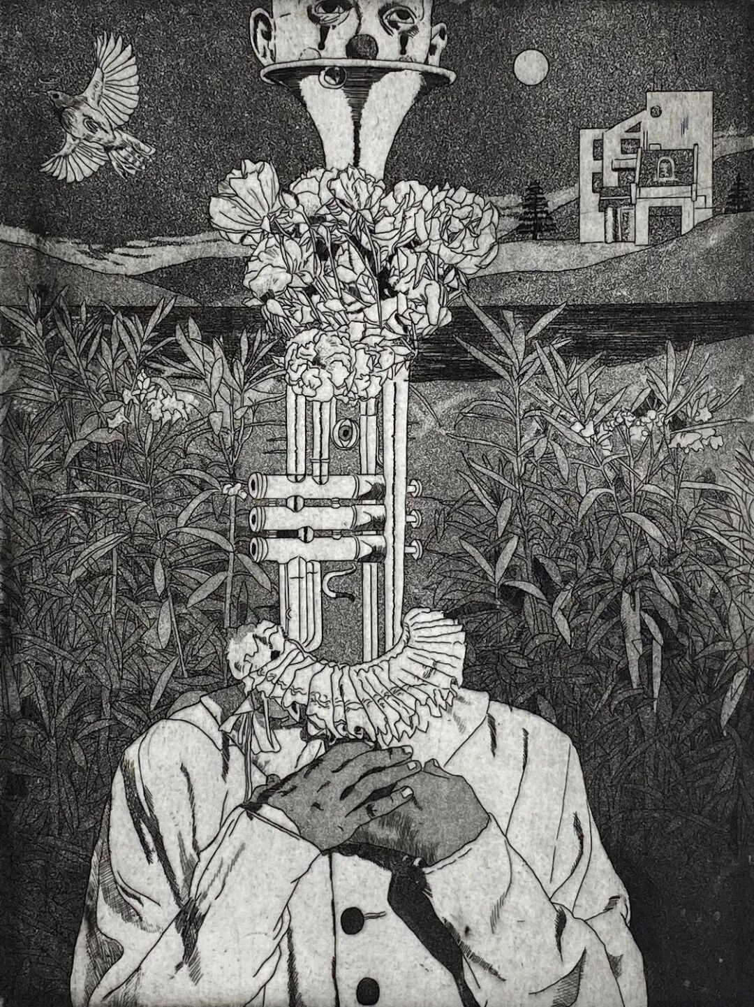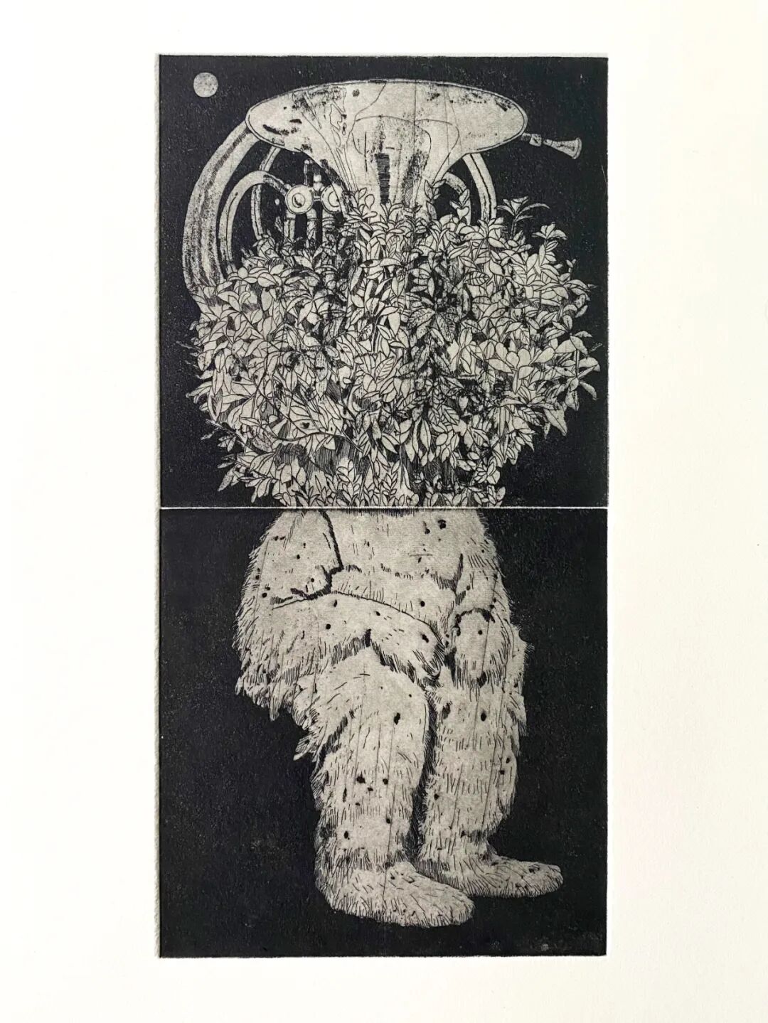 我的铜版作品基本是黑白为主,然后技法比较固定,飞尘腐蚀和线腐蚀两种,在其中出现的乐曲与花朵都是喜欢的元素。我自己很喜欢听音乐,特别喜欢小号的声音,给人感觉激昂,充满生命力的感觉。乐器也属人造的机械,和我的铜版画一样,都是用来生产艺术的机械,但是给人不一样的浪漫。