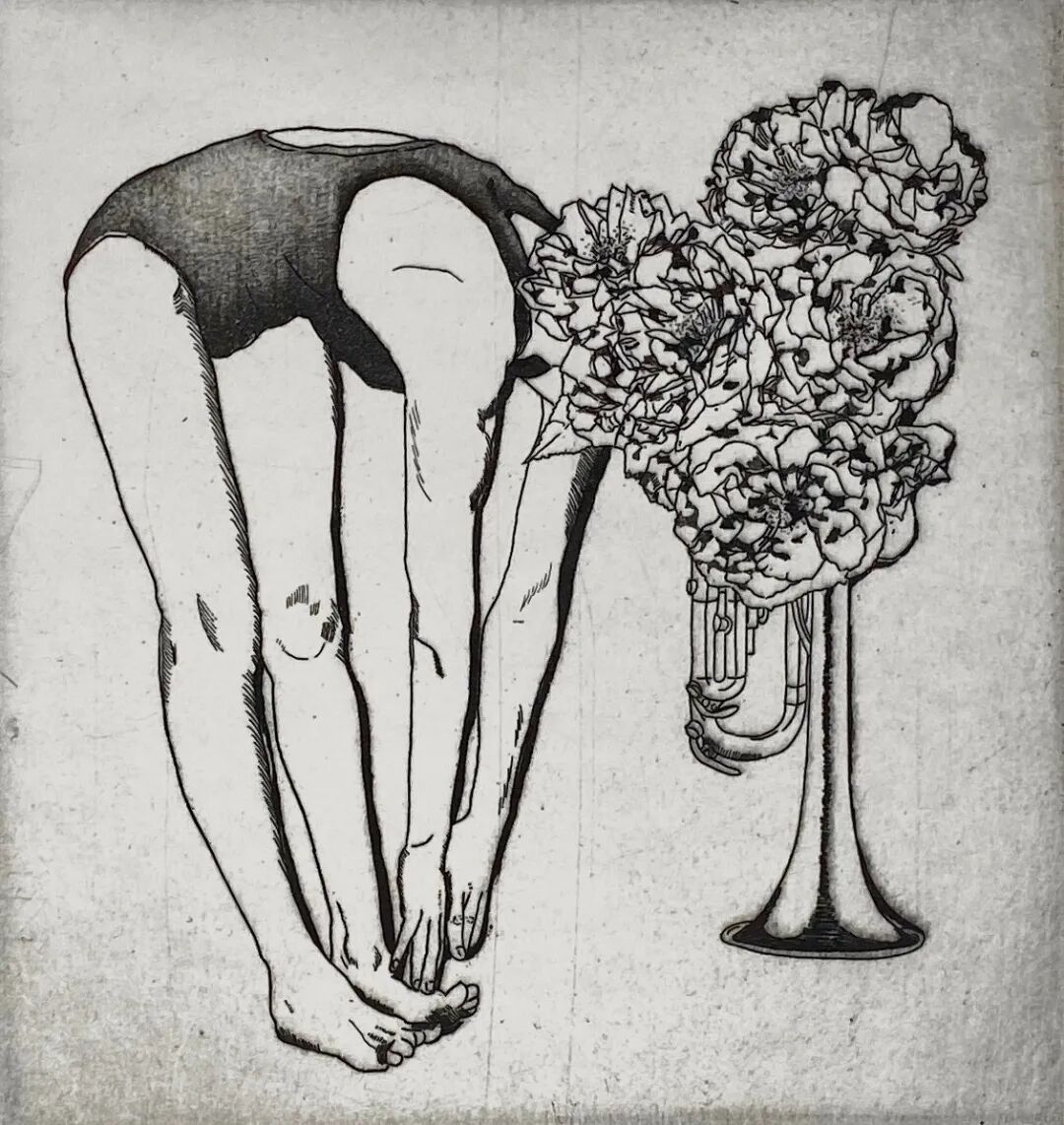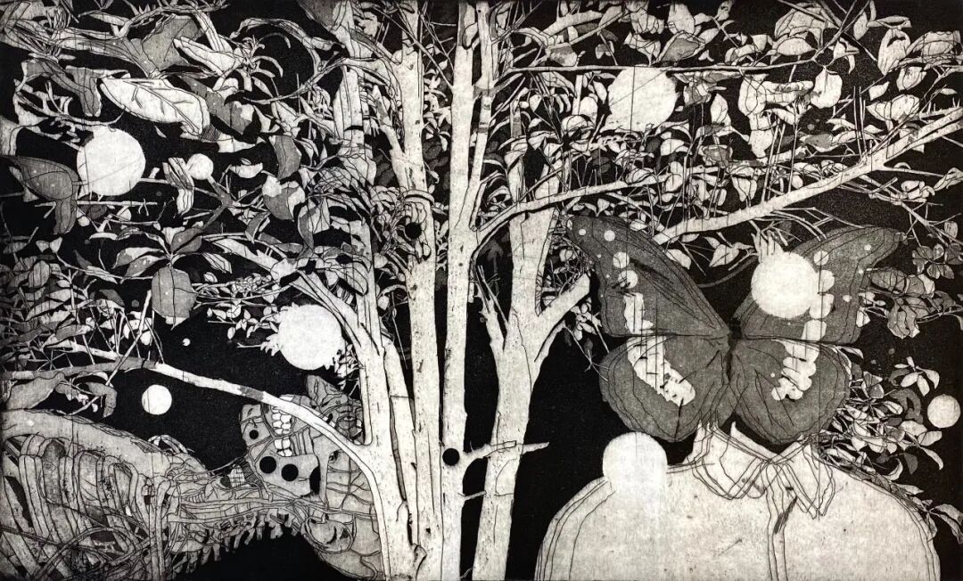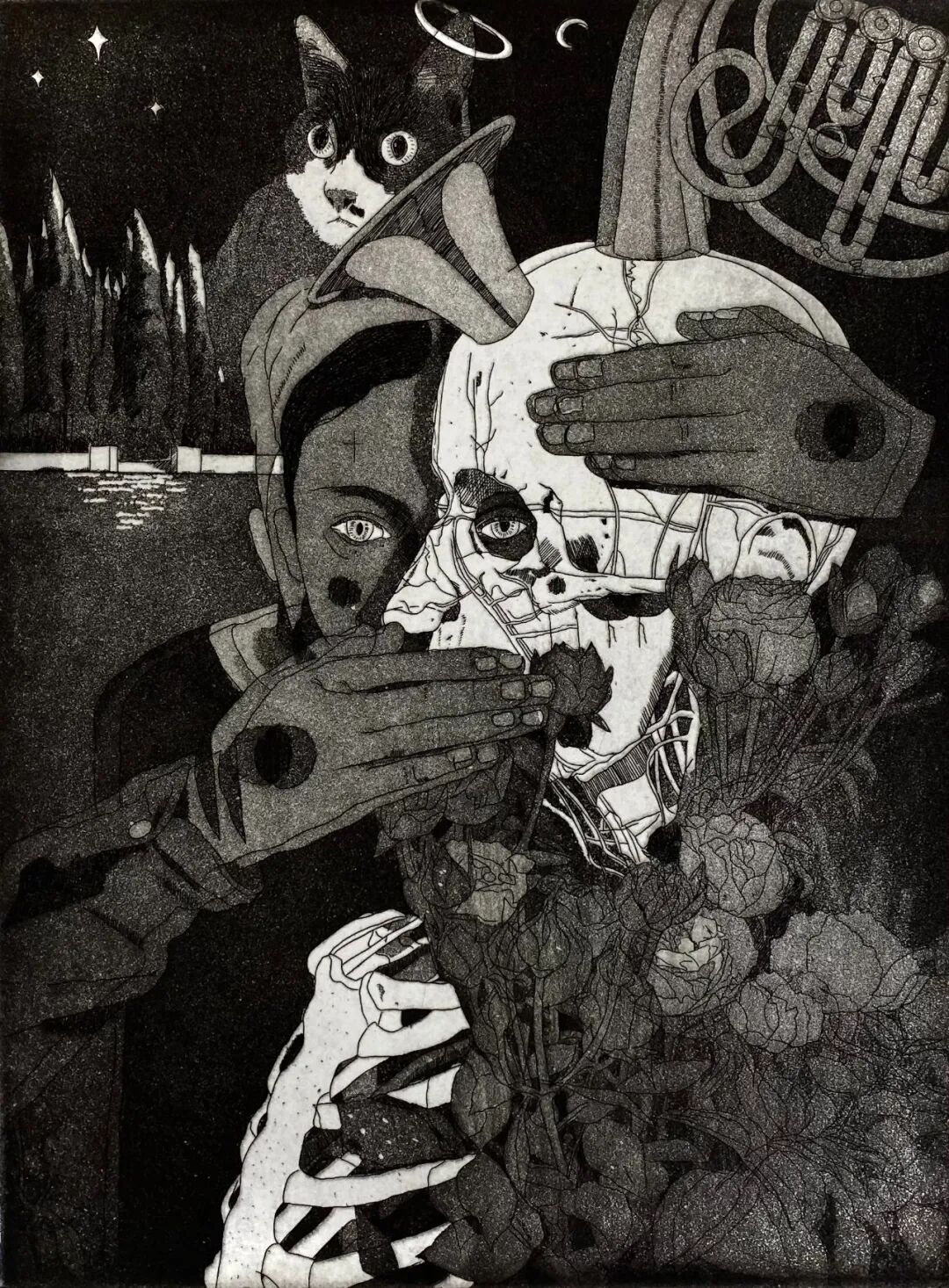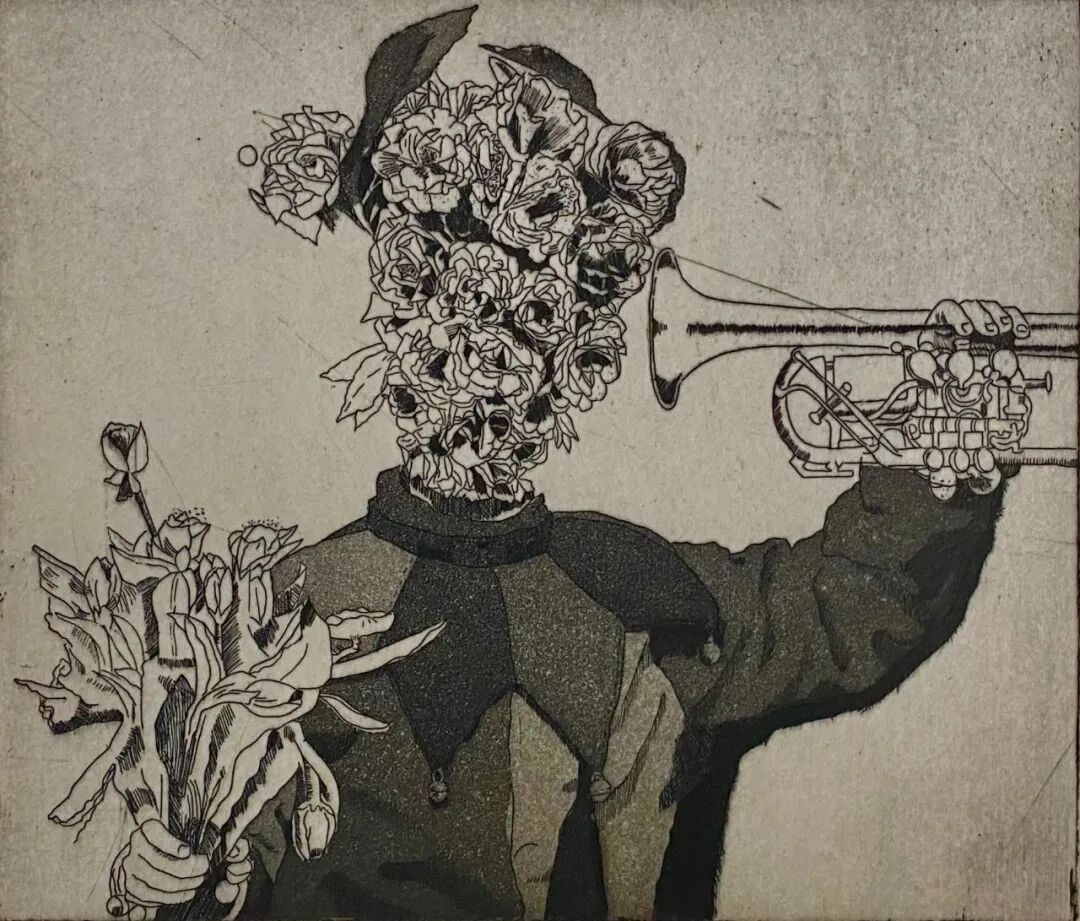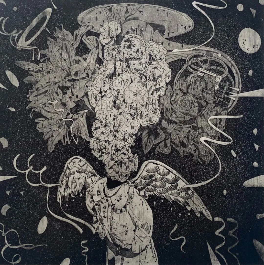我的铜版作品基本是黑白为主,然后技法比较固定,飞尘腐蚀和线腐蚀两种,在其中出现的乐曲与花朵都是喜欢的元素。我自己很喜欢听音乐,特别喜欢小号的声音,给人感觉激昂,充满生命力的感觉。乐器也属人造的机械,和我的铜版画一样,都是用来生产艺术的机械,但是给人不一样的浪漫。