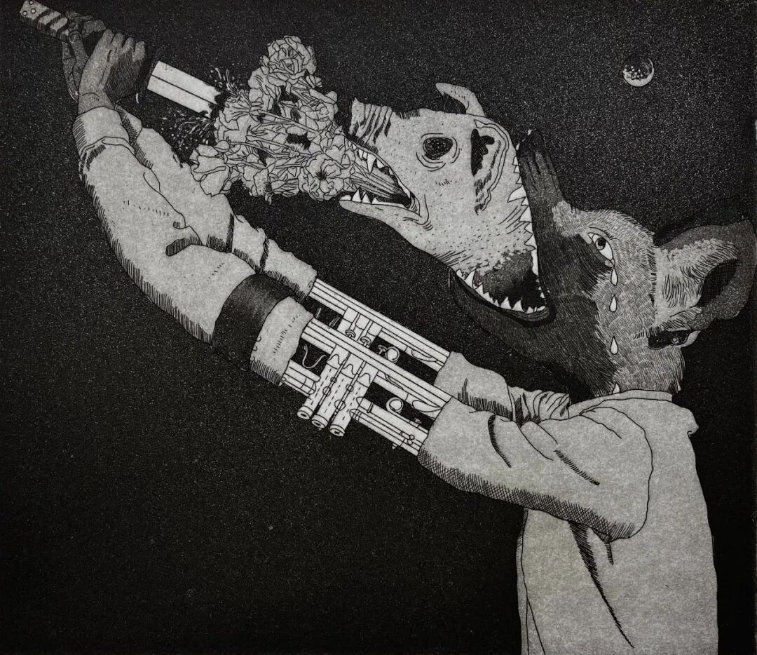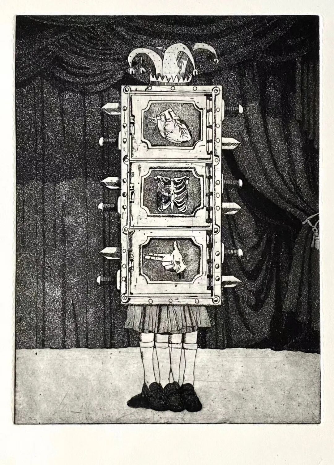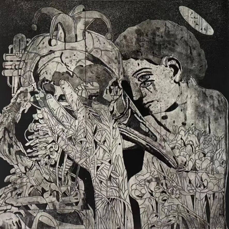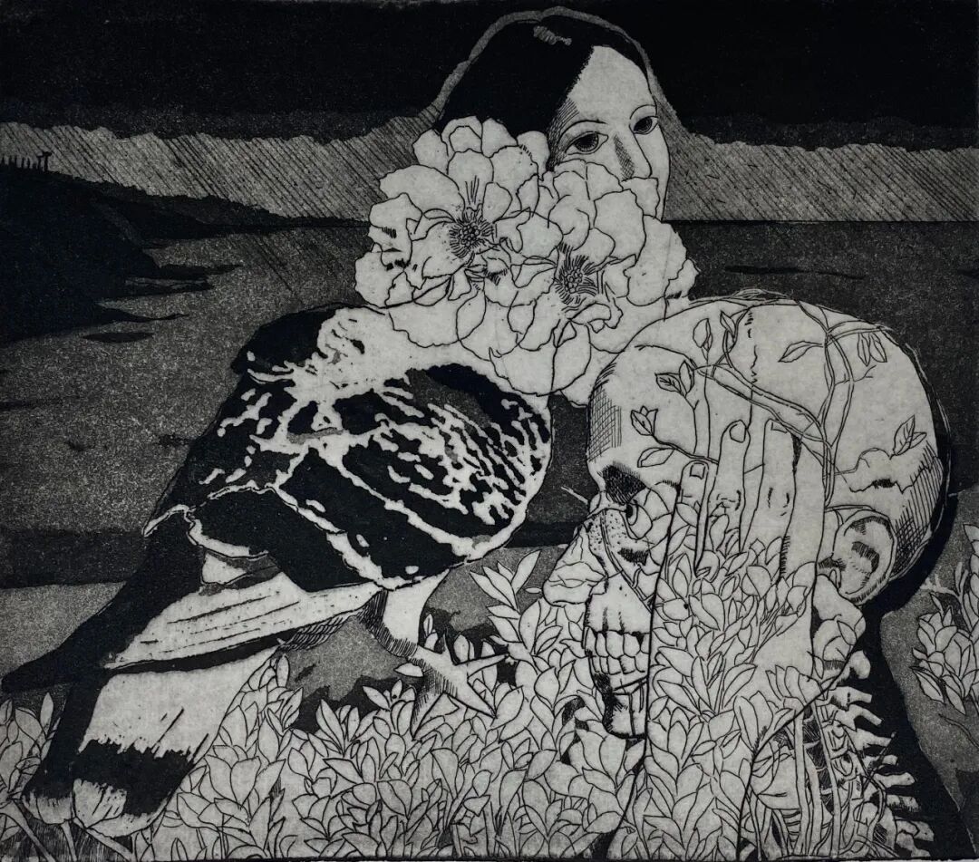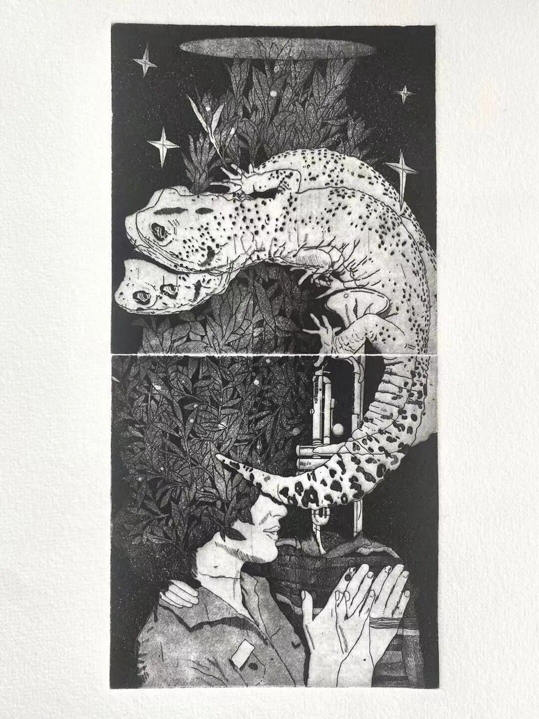 我的铜版作品基本是黑白为主,然后技法比较固定,飞尘腐蚀和线腐蚀两种,在其中出现的乐曲与花朵都是喜欢的元素。我自己很喜欢听音乐,特别喜欢小号的声音,给人感觉激昂,充满生命力的感觉。乐器也属人造的机械,和我的铜版画一样,都是用来生产艺术的机械,但是给人不一样的浪漫。
