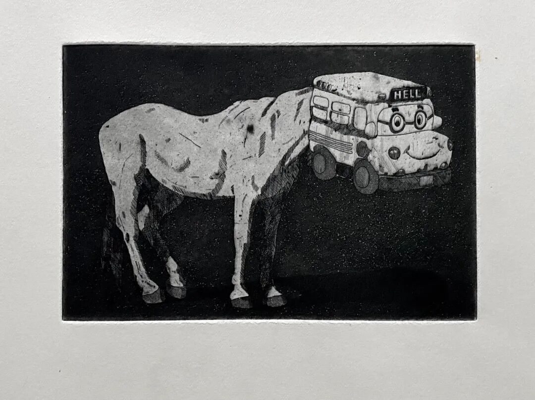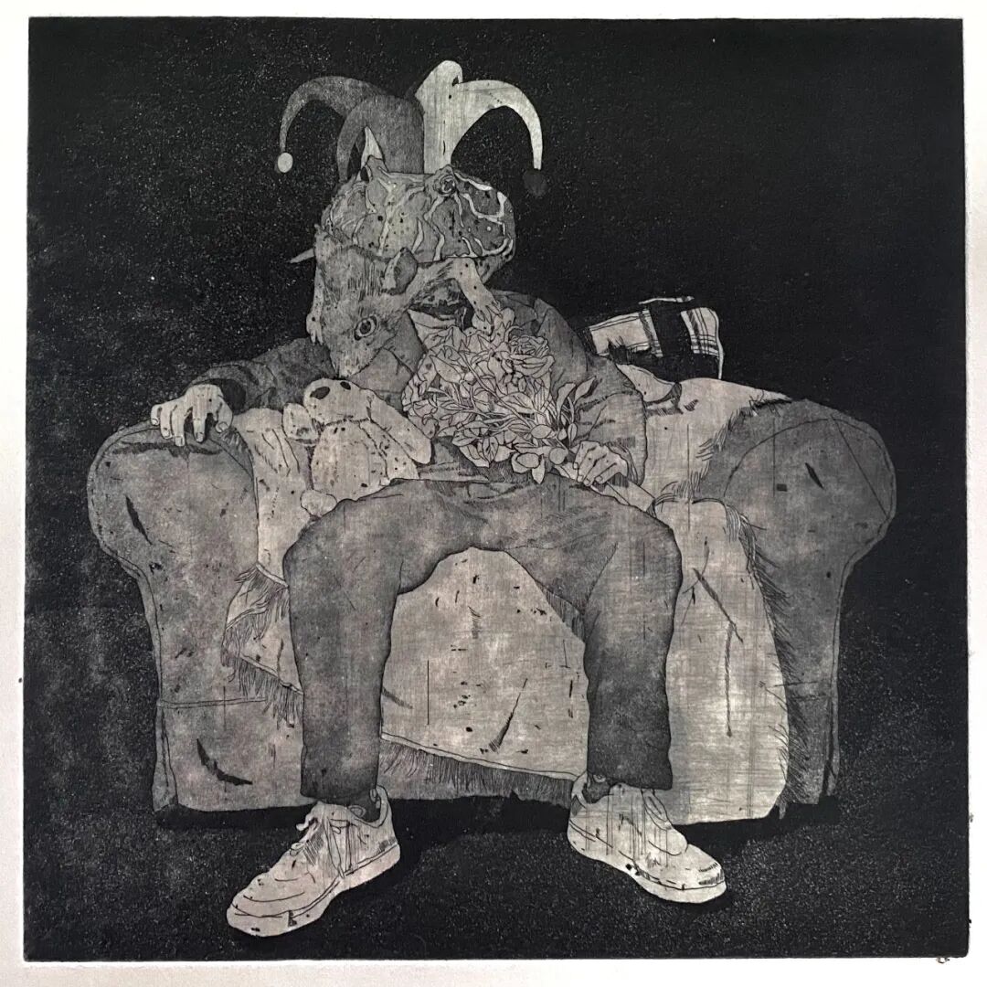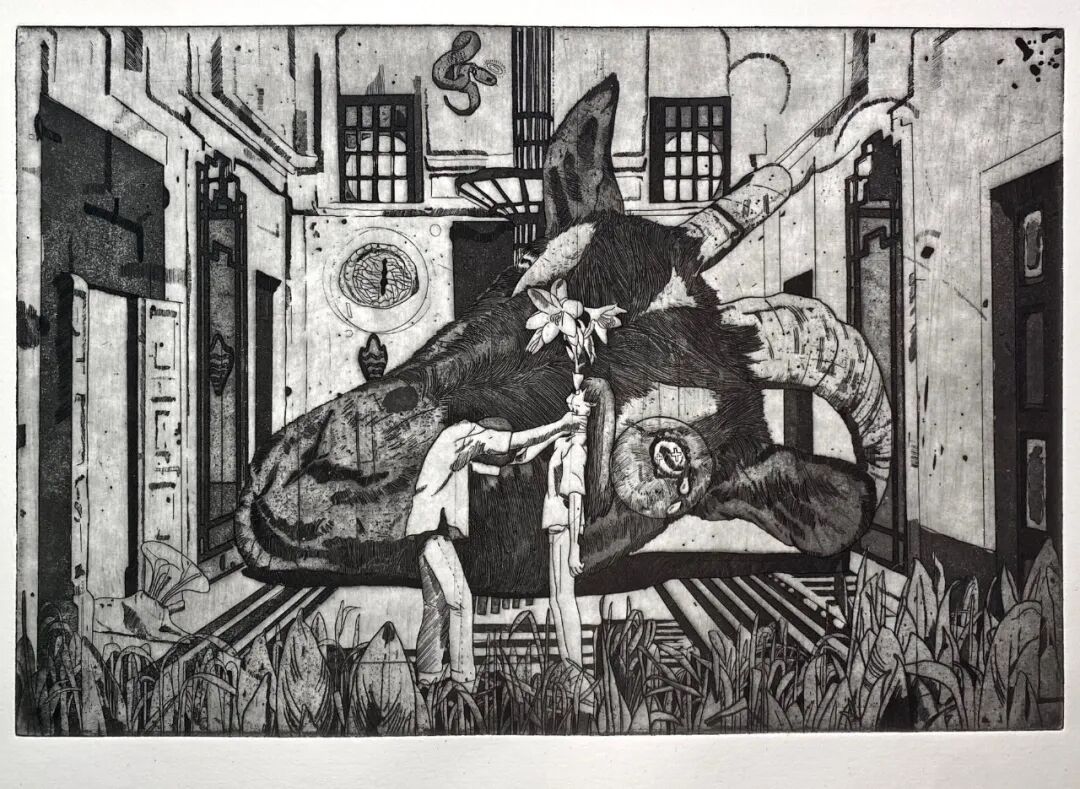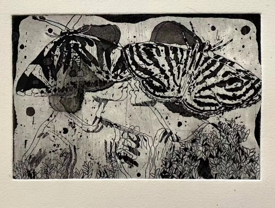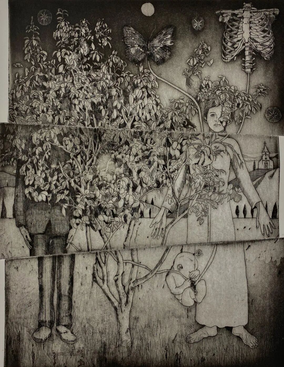 我的铜版作品基本是黑白为主,然后技法比较固定,飞尘腐蚀和线腐蚀两种,在其中出现的乐曲与花朵都是喜欢的元素。我自己很喜欢听音乐,特别喜欢小号的声音,给人感觉激昂,充满生命力的感觉。乐器也属人造的机械,和我的铜版画一样,都是用来生产艺术的机械,但是给人不一样的浪漫。