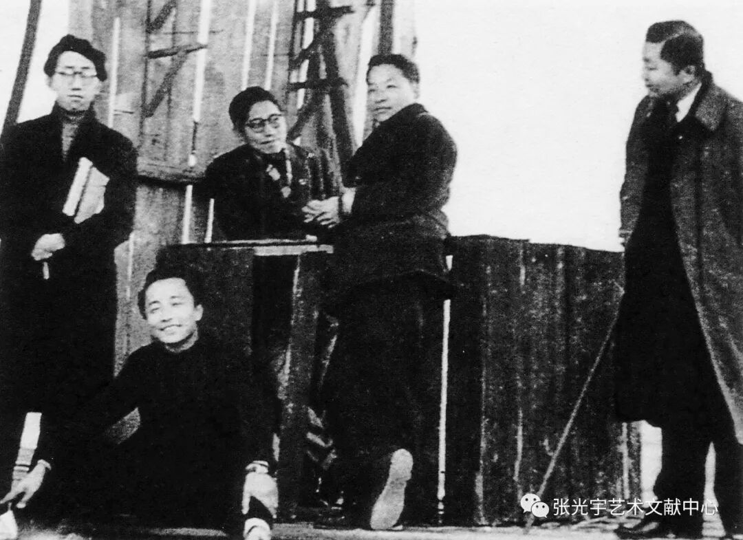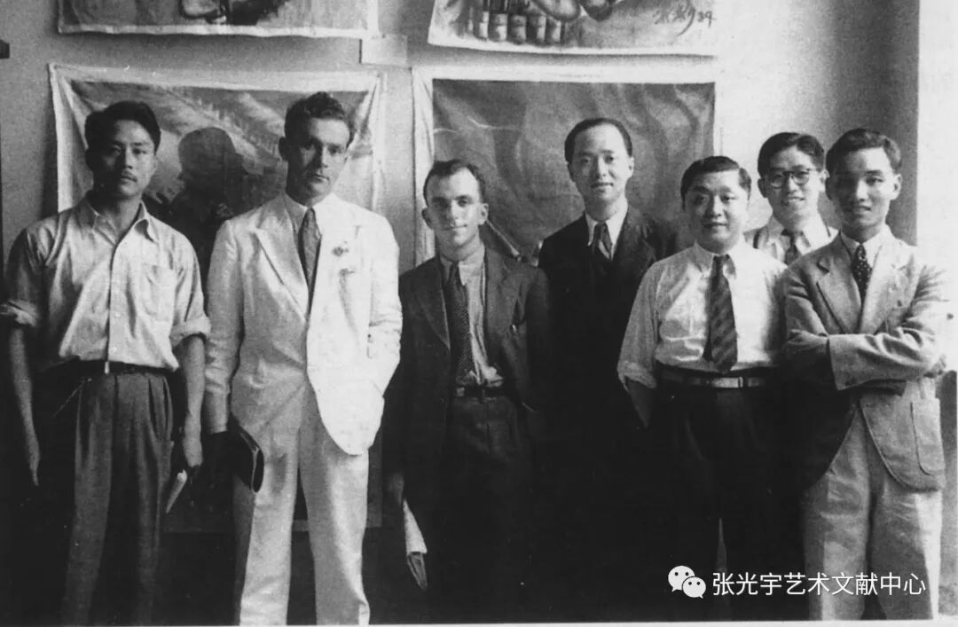 在香港抗日宣传画预展会上,左起:叶浅予、斯诺、爱泼斯坦、金仲华、张光宇、丁聪、陈宪锜,1939年