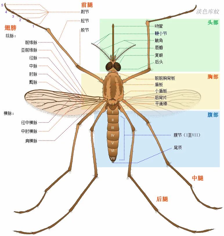 ▲ 淡色库蚊(尖音库蚊的一个地理亚种,是常见的“家蚊”)的结构示意图。图/Wikipedia