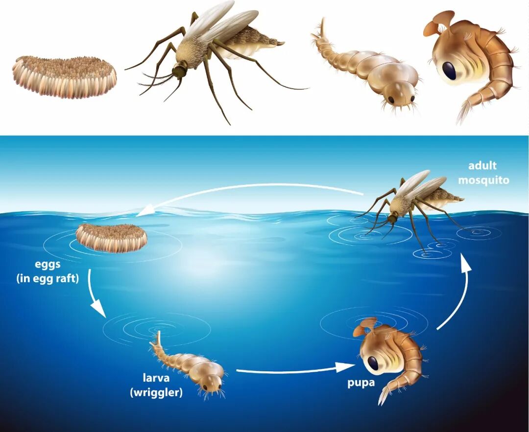 ▲ 蚊子的生长阶段,依次为卵、幼虫、蛹、成虫。图/视觉中国