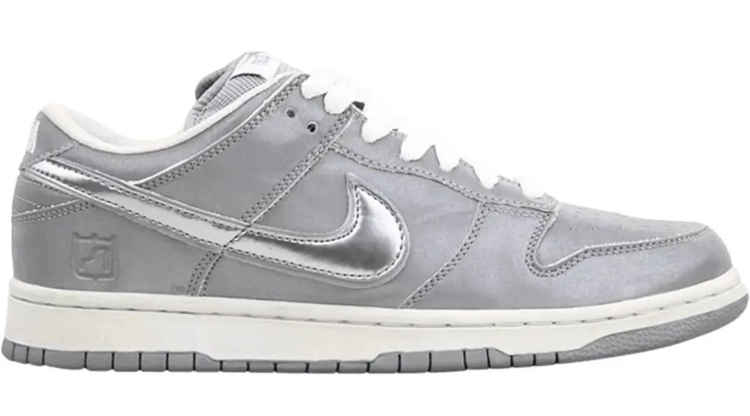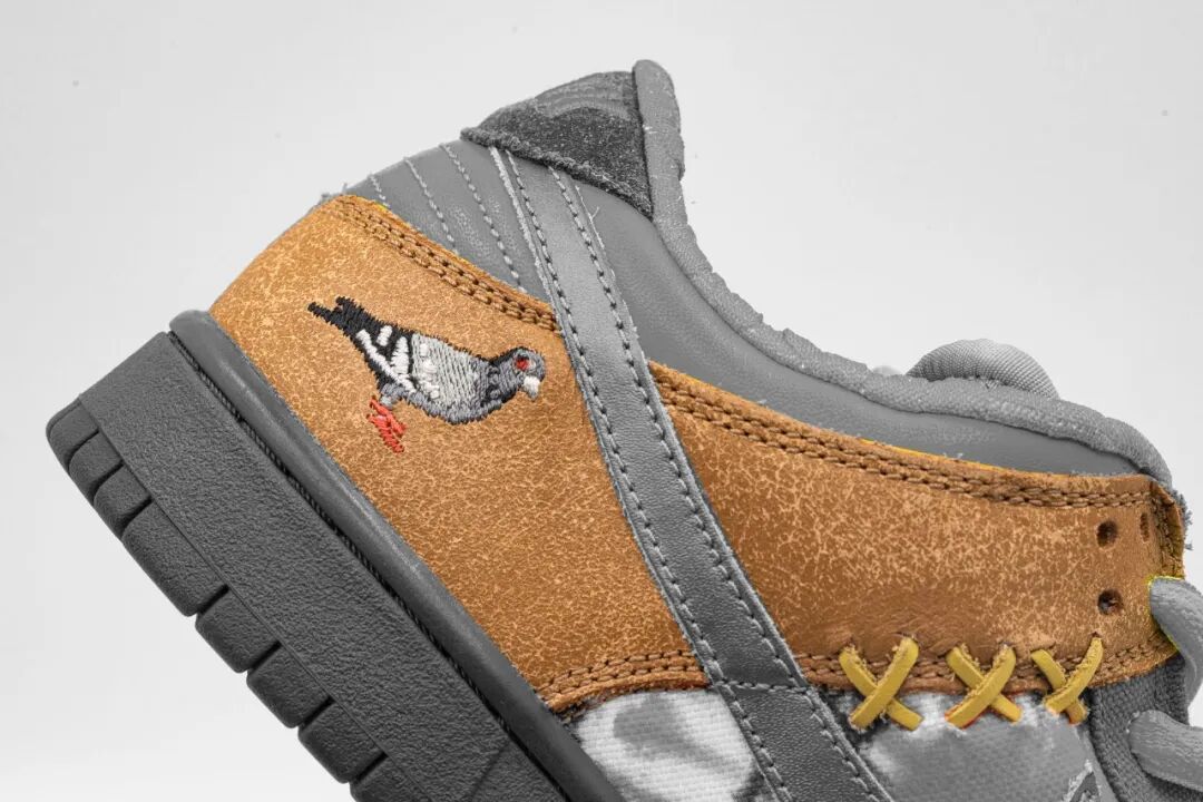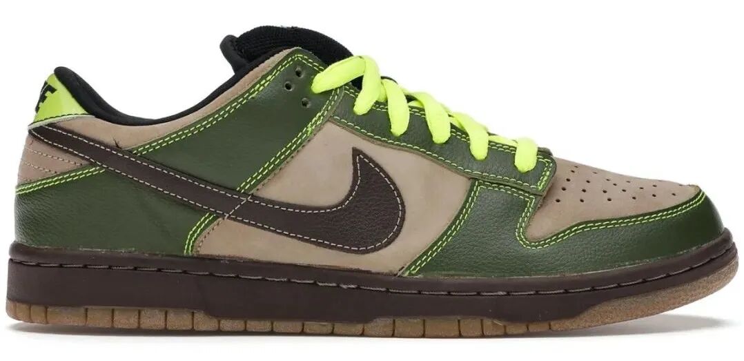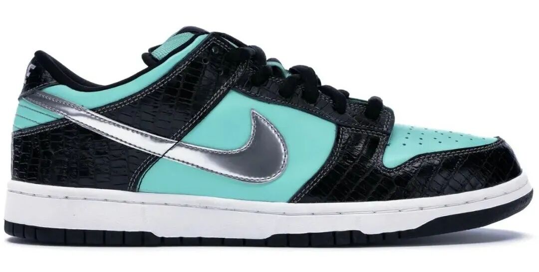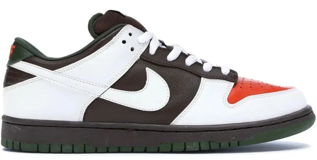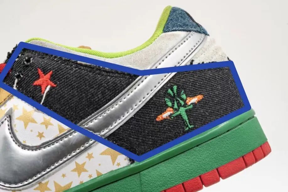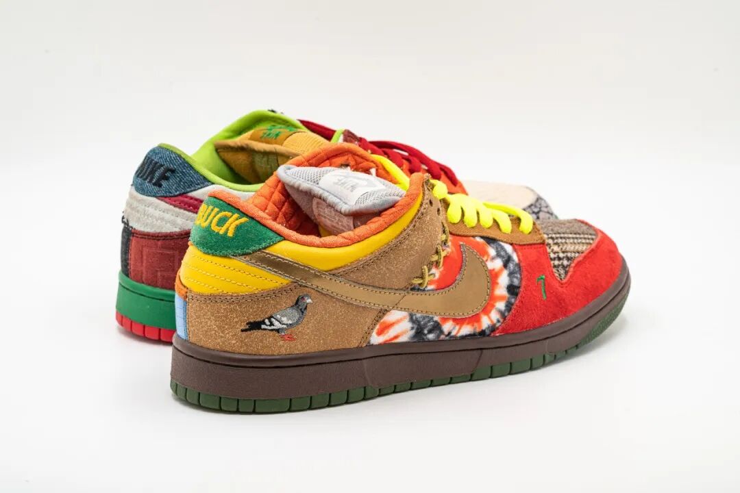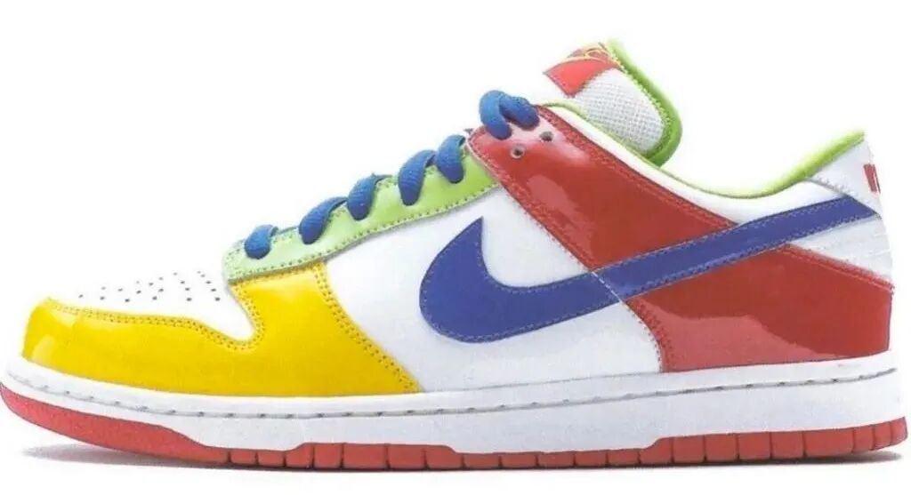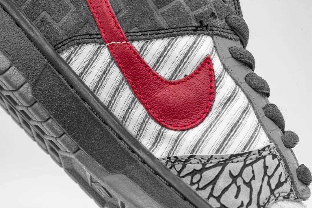 说回这双鞋,这双鞋的概念在当年无疑是具有超前性的,它融合了当时已发售的 SB Dunk 鞋款中的一些经典之作,取其精华并按照鞋型的特有结构进行排布,最终形成了一双左右完全不对称的"大杂烩"。