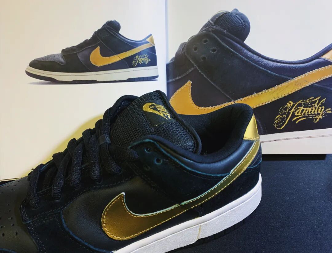 这双 Takashi 的样品版本,其后跟带有花体的「Family」字样,象征着 Nike SB 大家庭的成员们。