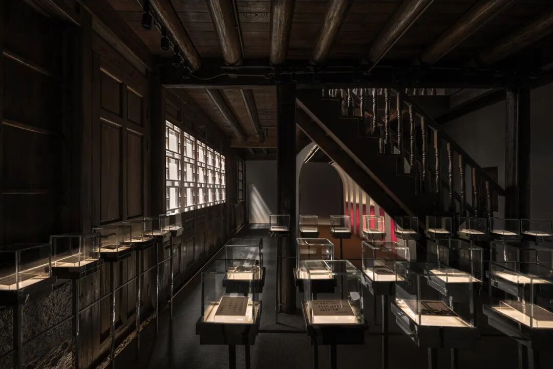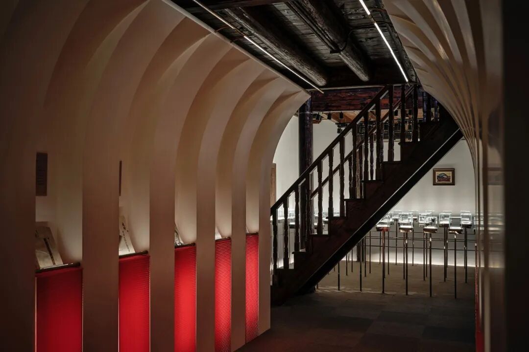 董先生生平故事与留存实物在27㎡南侧回廊徐徐展开,展架使用简洁的香樟木,平添温暖,开放框架和热烈纯粹的红,又赋予空间一抹时尚现代。