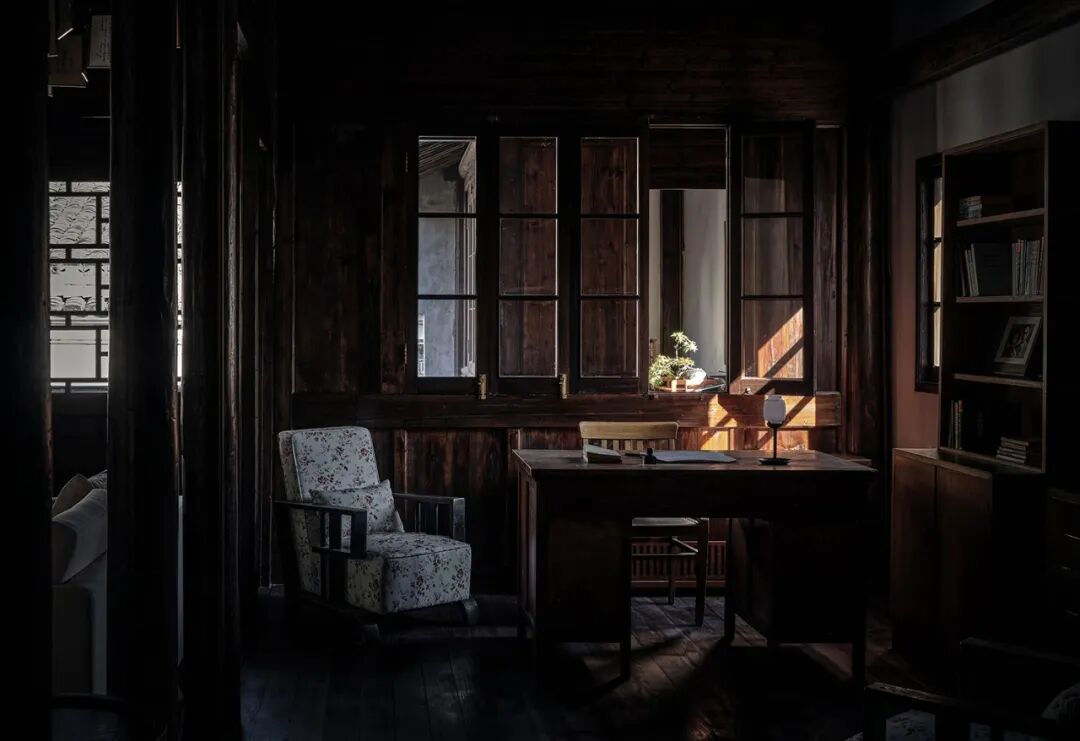 特别温情的一幕还有,设计师从先生生前的办公室运来的两把老式扶手椅,经过清洗修复和另外几件旧物一起复原了17㎡的书房旧影。