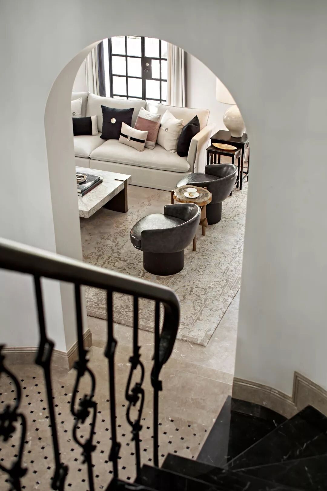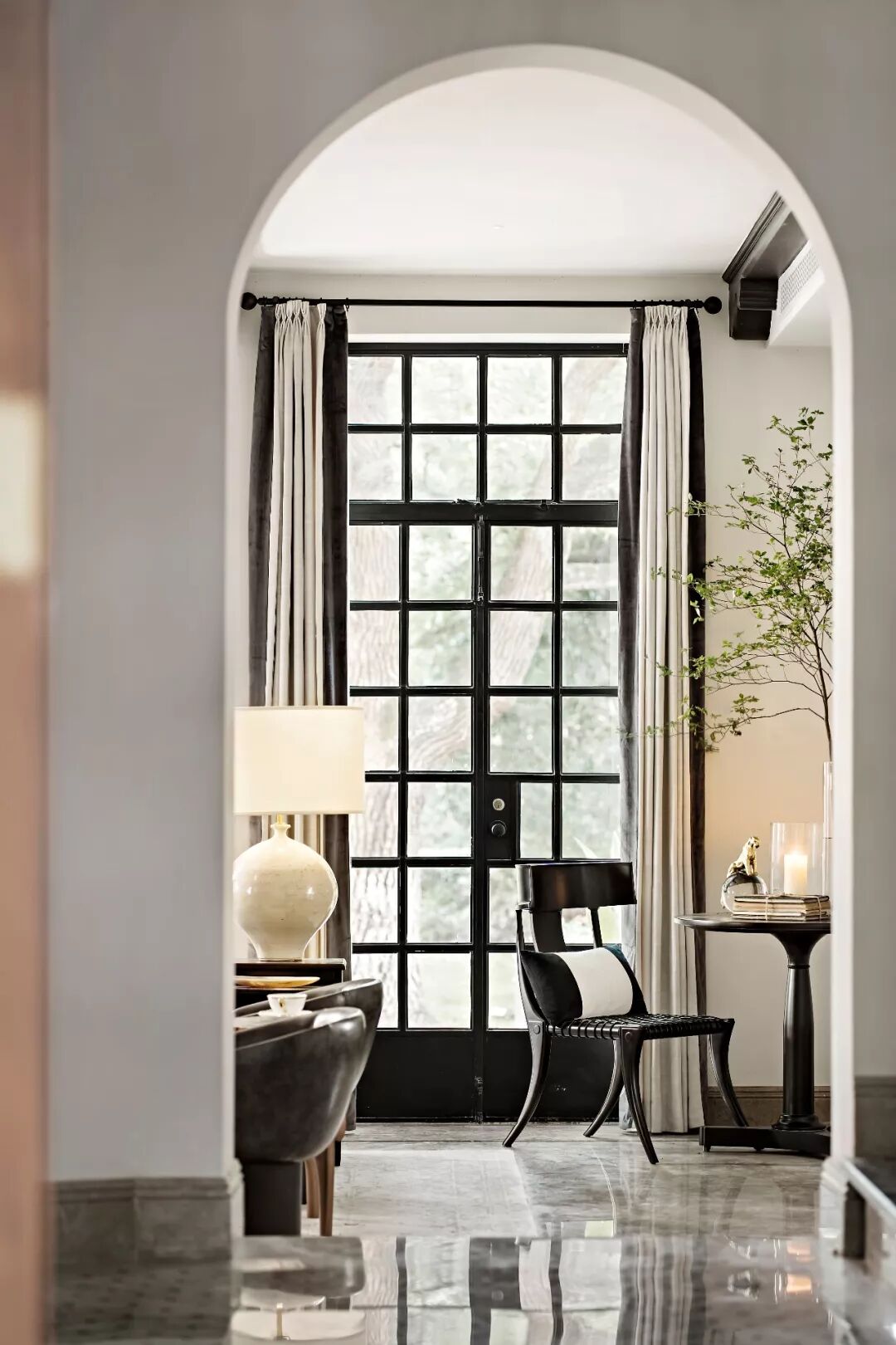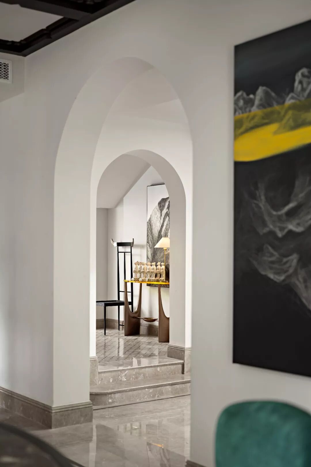 从建筑外观到室内,半圆拱门无疑是设计中最引人注目的亮点,复古的几何线条在路径交汇处划下自由洒脱的一笔,破格又落定,促成双空间的汇聚。