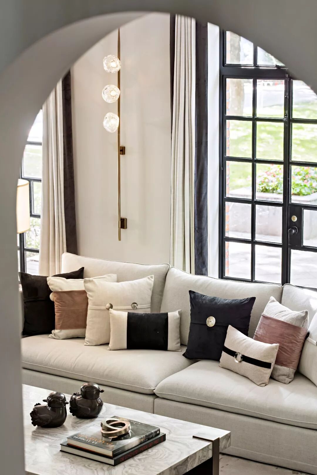 客厅以素净的米白色为主基调,复古装饰横梁与欧式窗格将空间轻柔切割,连带着投进室内的光线也多了几分雅致。