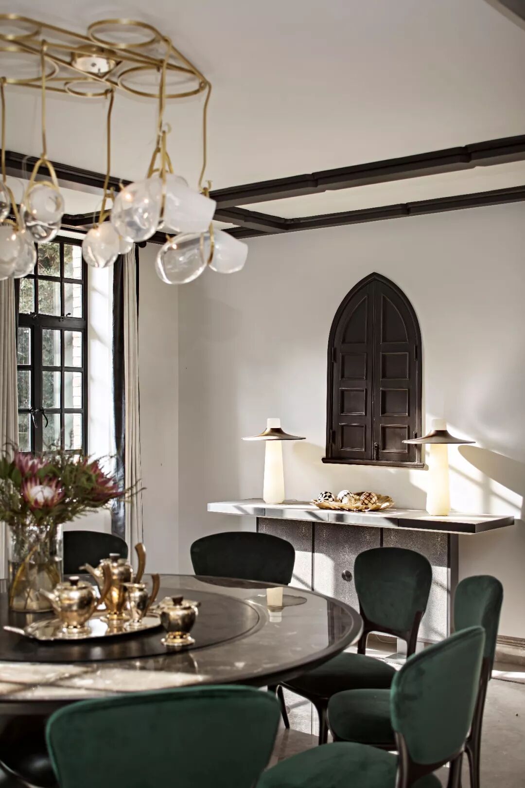 设计师在开放式餐厅汇入大面积的墨绿色,这也是浪漫主义画家但丁·加百列·罗塞蒂毕生钟爱的颜色。它温情而清醇,神秘中带着些许明朗,似幽深林间漫溢出的一抹芳香,在复古格调中自在畅游。