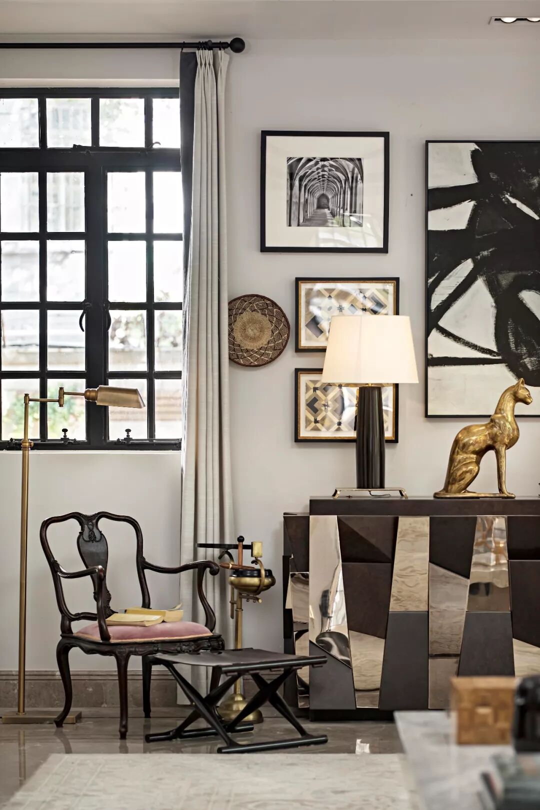 设计师用跳色的编织盘与抽象艺术画将微量的彩色叠加进黑白灰的间隙中,呈现出别样、细腻的风情。而左下角的守护猫,一如埃及传说中神秘的幸运守护者,正看顾著明亮通透的窗外,不断朝曦夕映的美好时光。