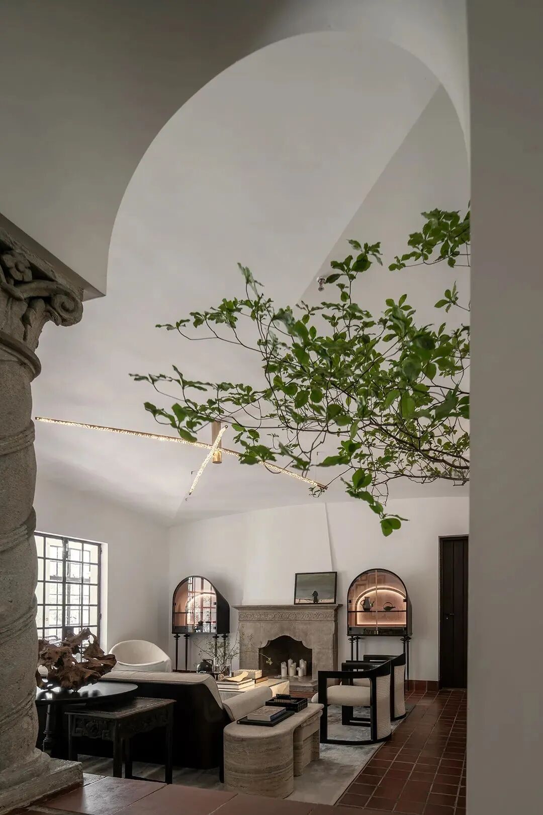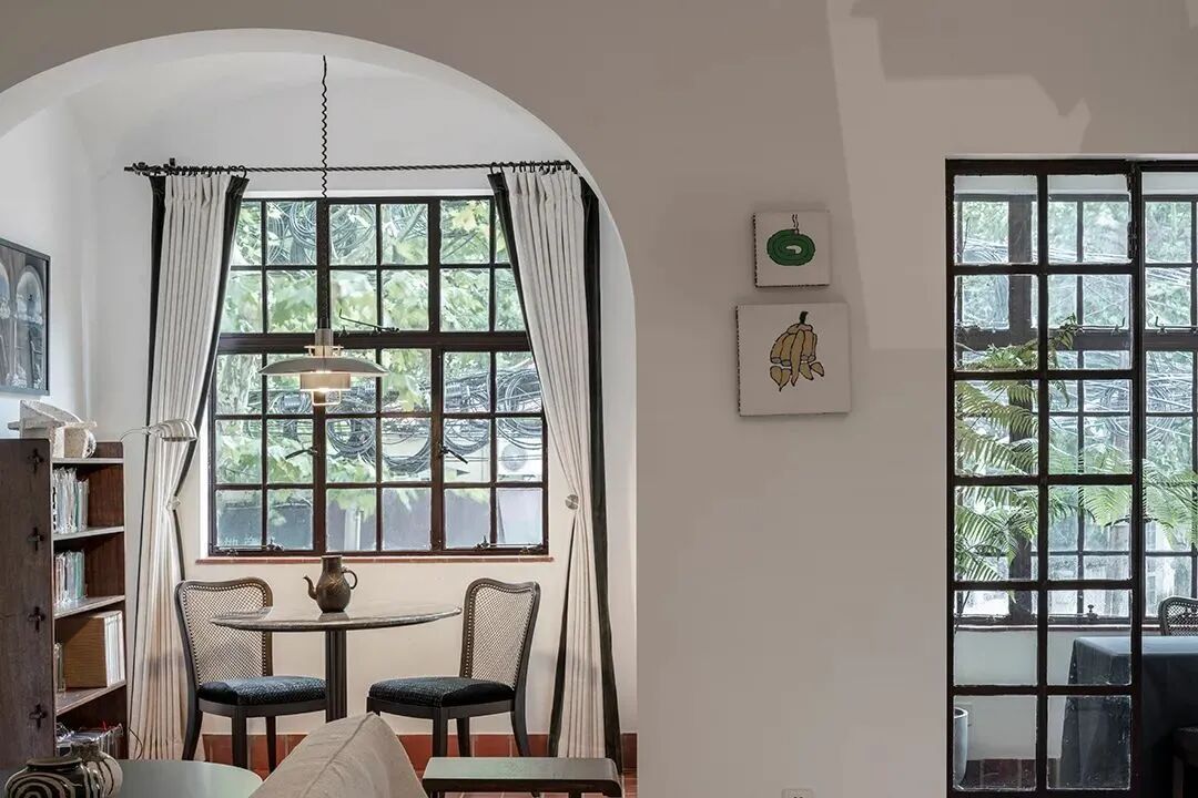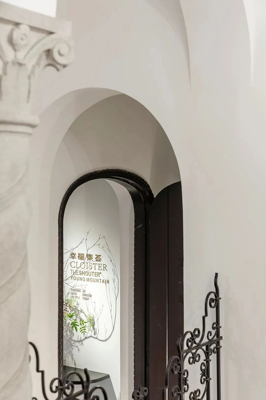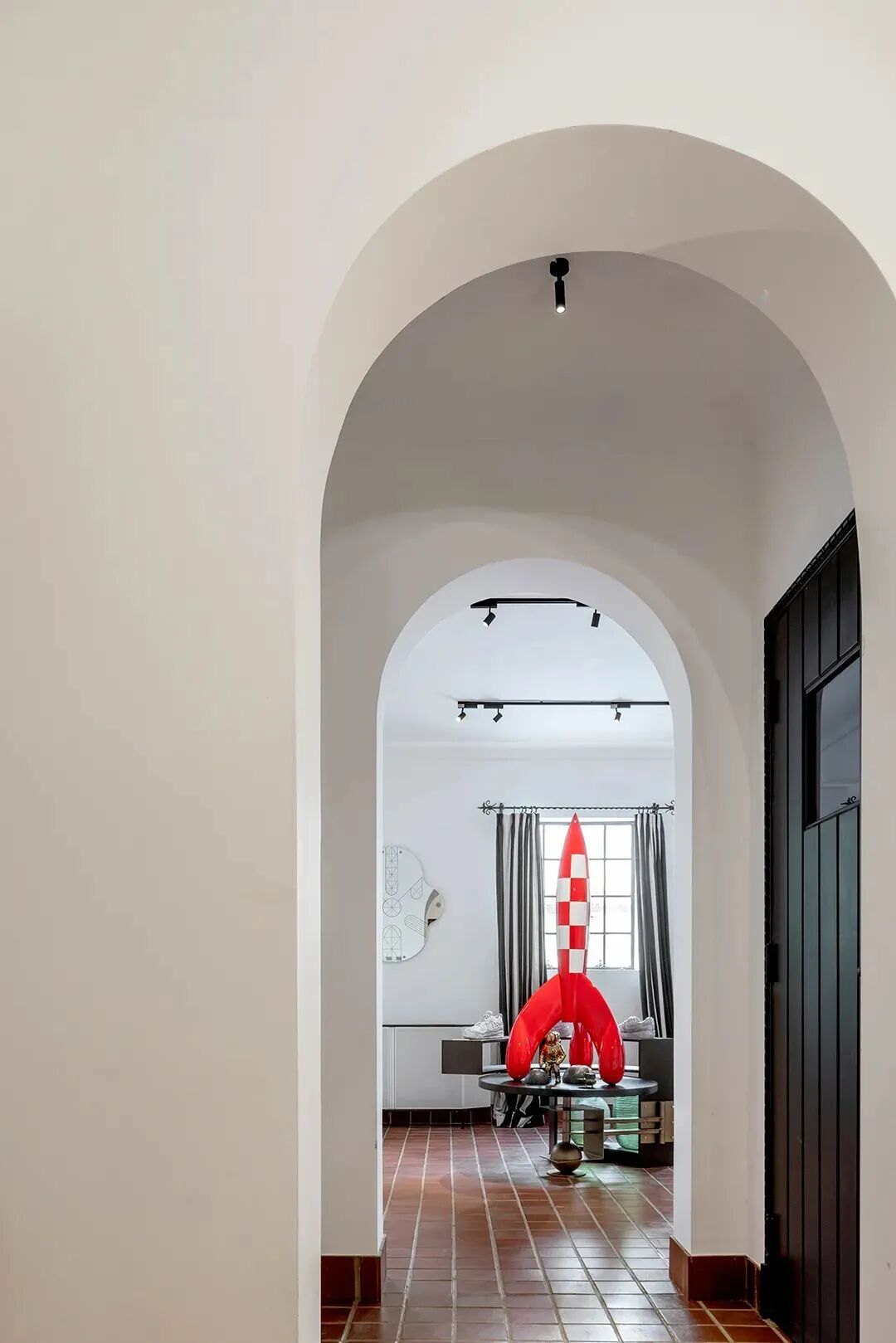从建筑外观到室内,半圆拱门无疑是设计中最引人注目的亮点,复古的几何线条在路径交汇处划下自由洒脱的一笔,破格又落定,促成双空间的汇聚。