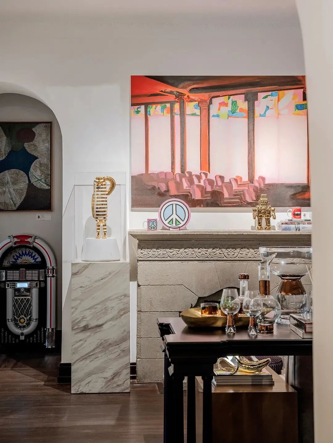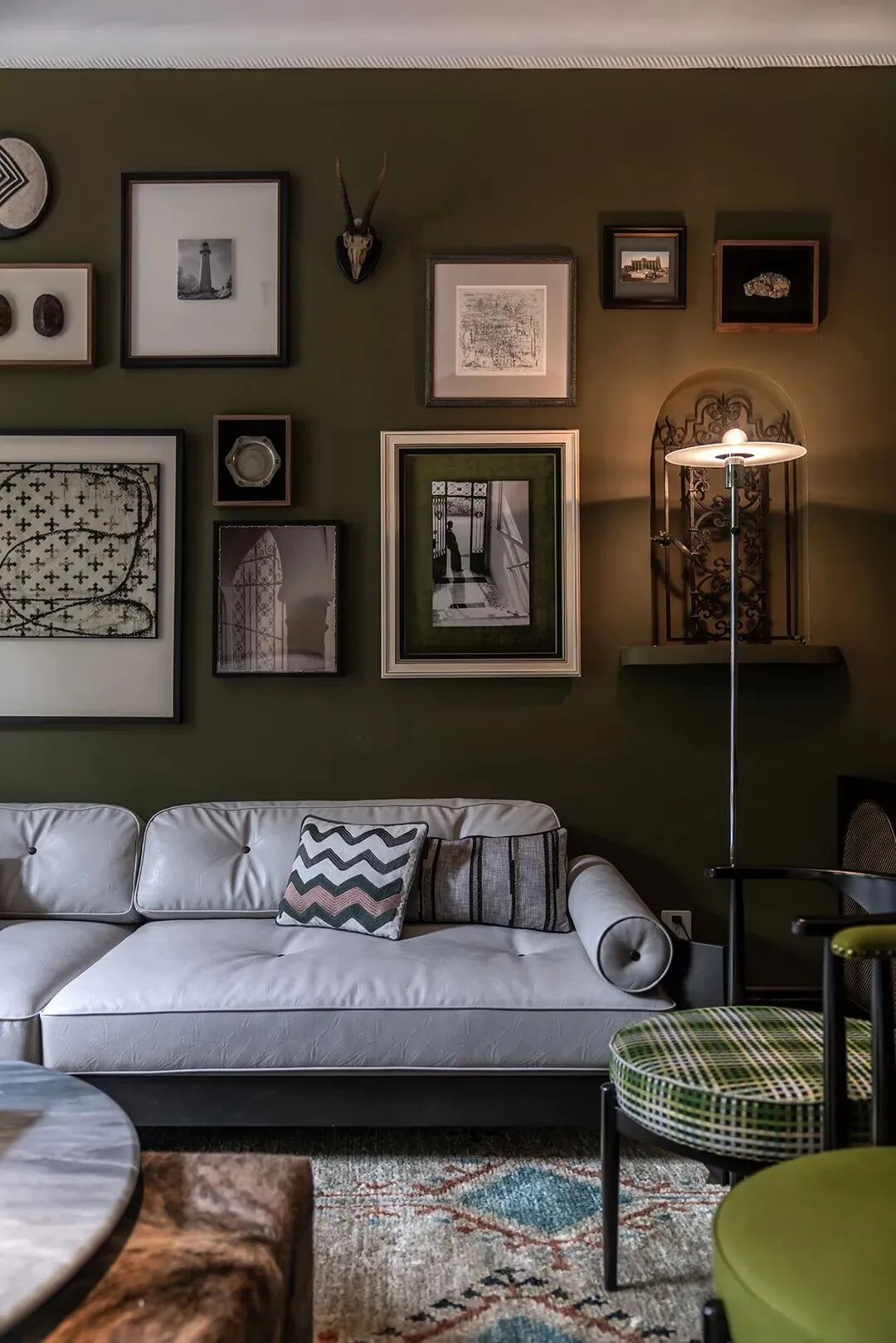 客厅展示墙,以混搭风格为墙面做诠释,以多层次东西方民族意境,铺陈出Art deco风格的叙事展现。原始的羚羊头饰,彷若征服野性蛮荒,象征胜利光辉。钥匙是正在延续着的权势标志。