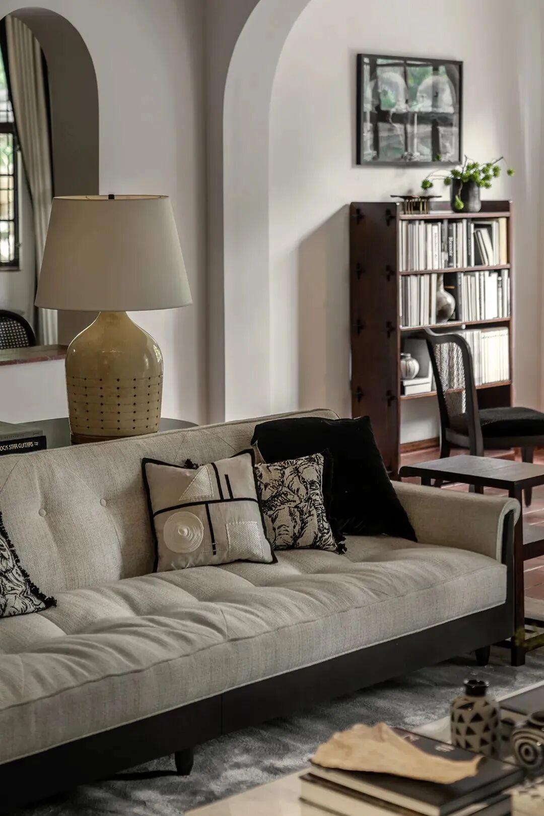 客厅以素净的米白色为主基调,复古装饰横梁与欧式窗格将空间轻柔切割,连带着投进室内的光线也多了几分雅致。