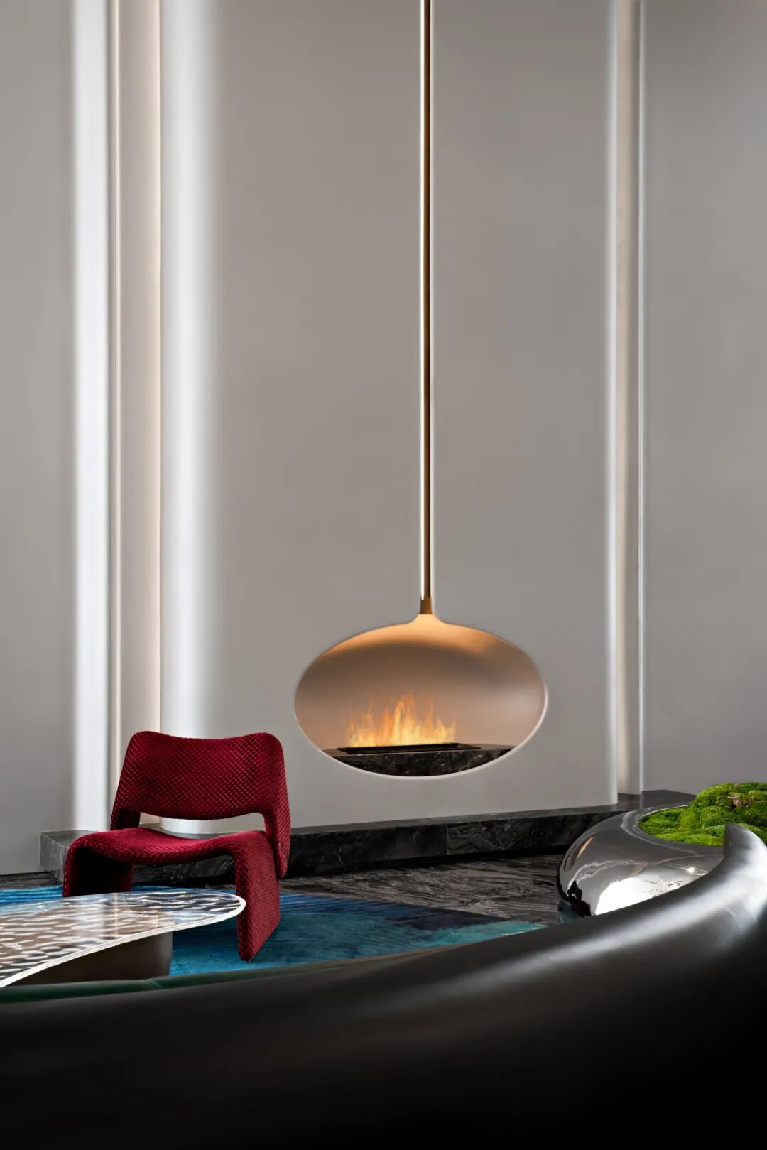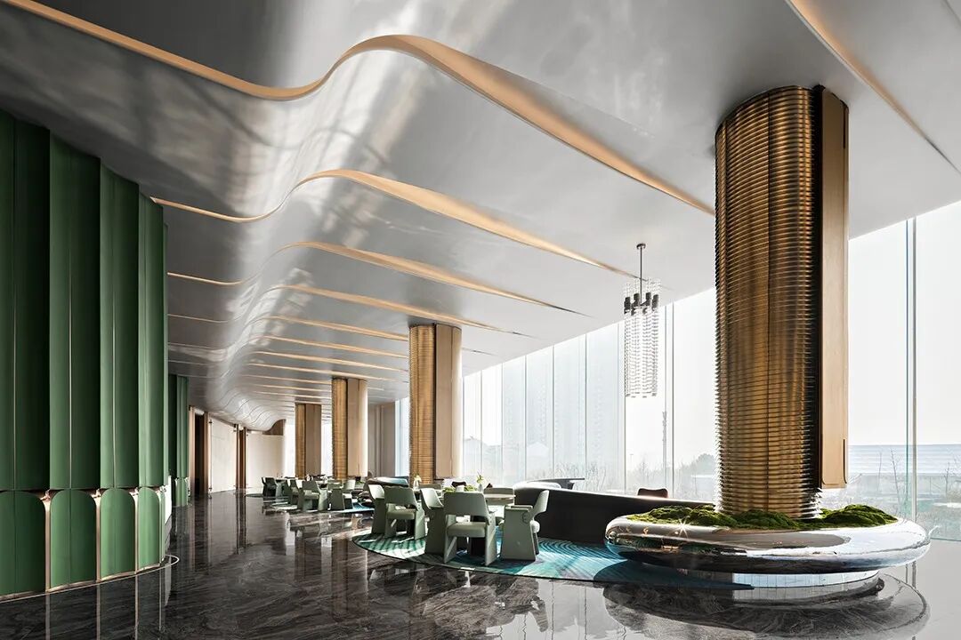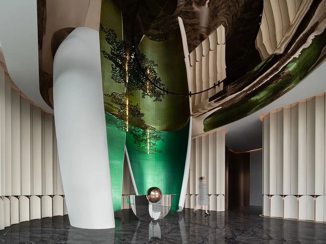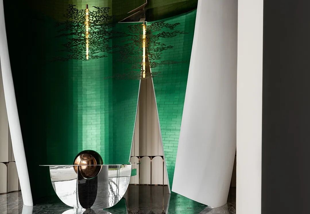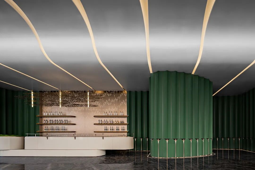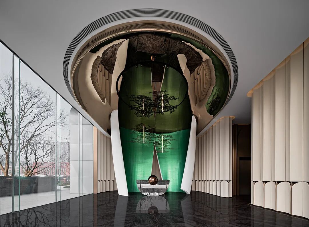 空间顶部的镜面,反射出丰富的视觉层次,将艺术性的曲线融于现代风格的空间设计中,焕发生活新奇探索。