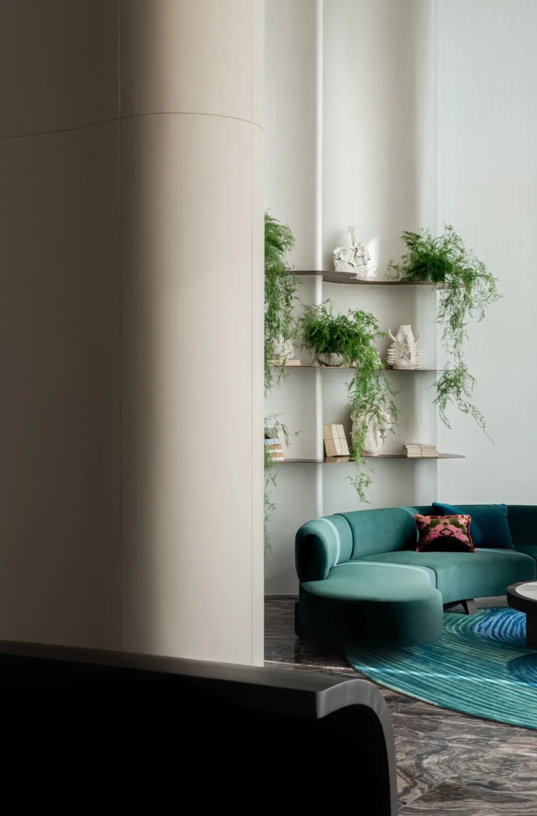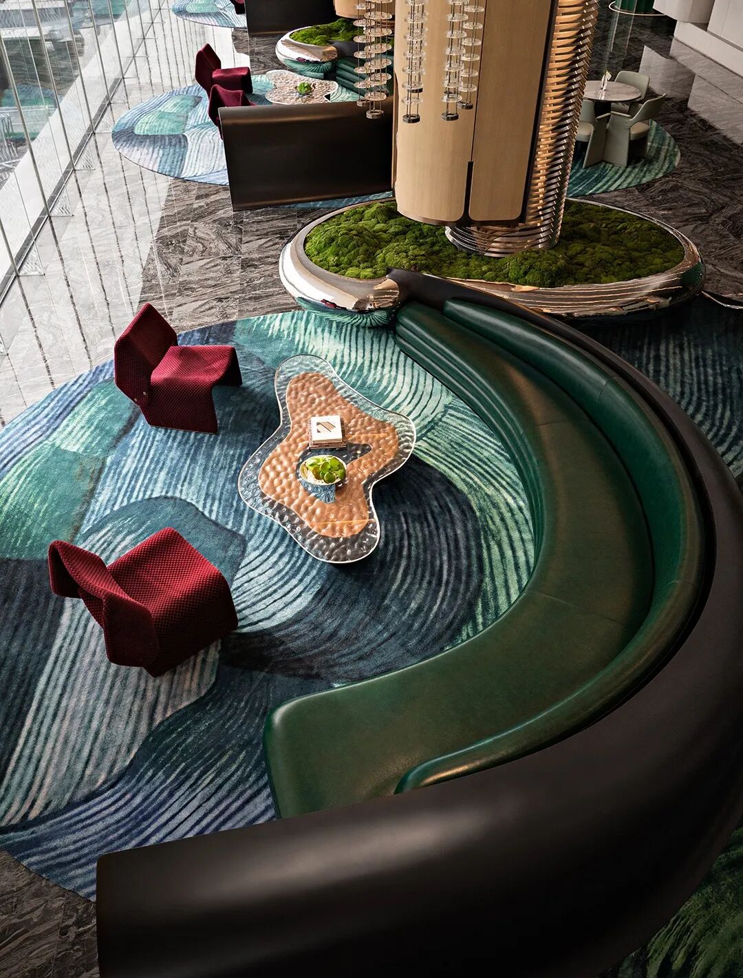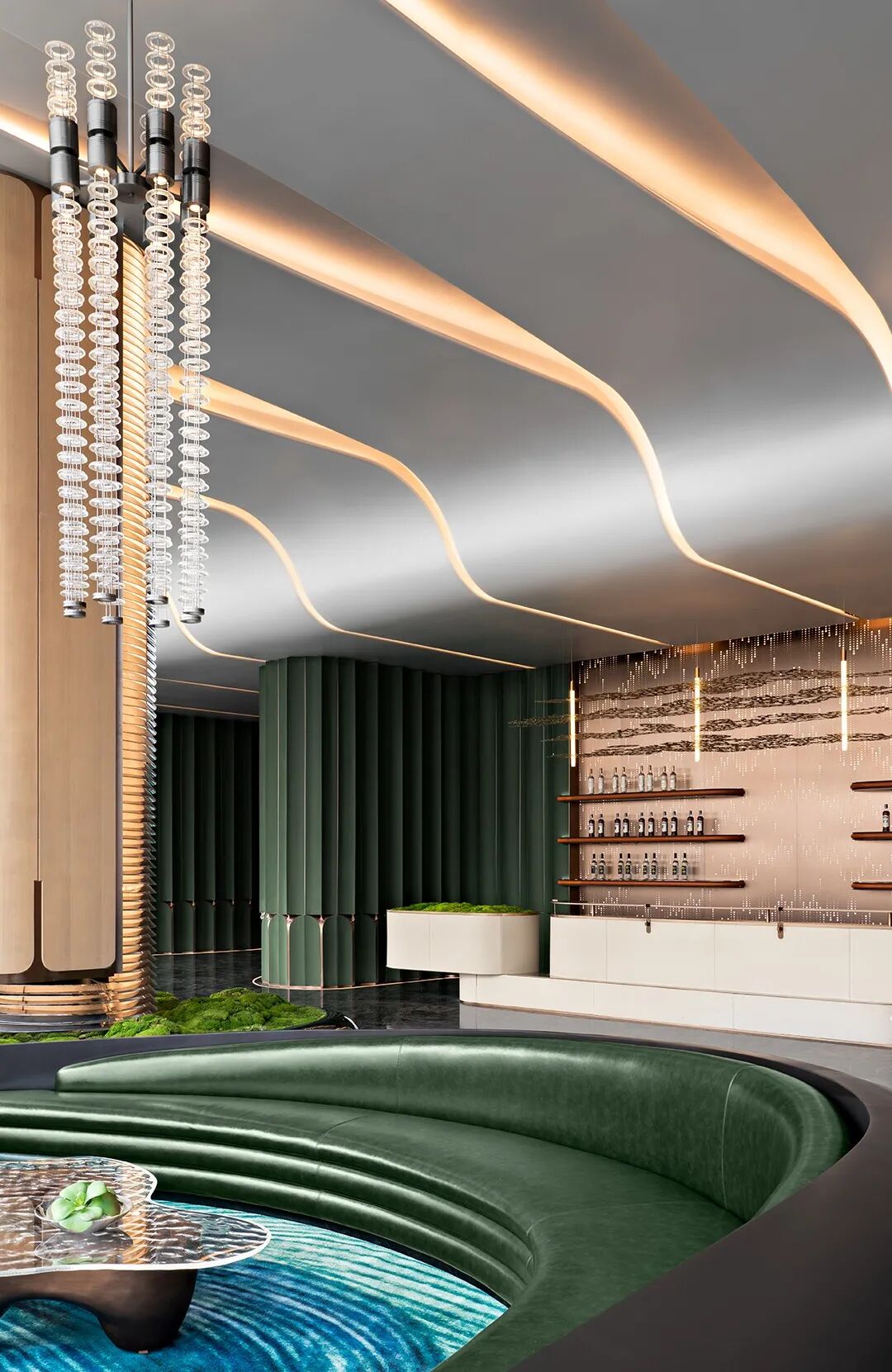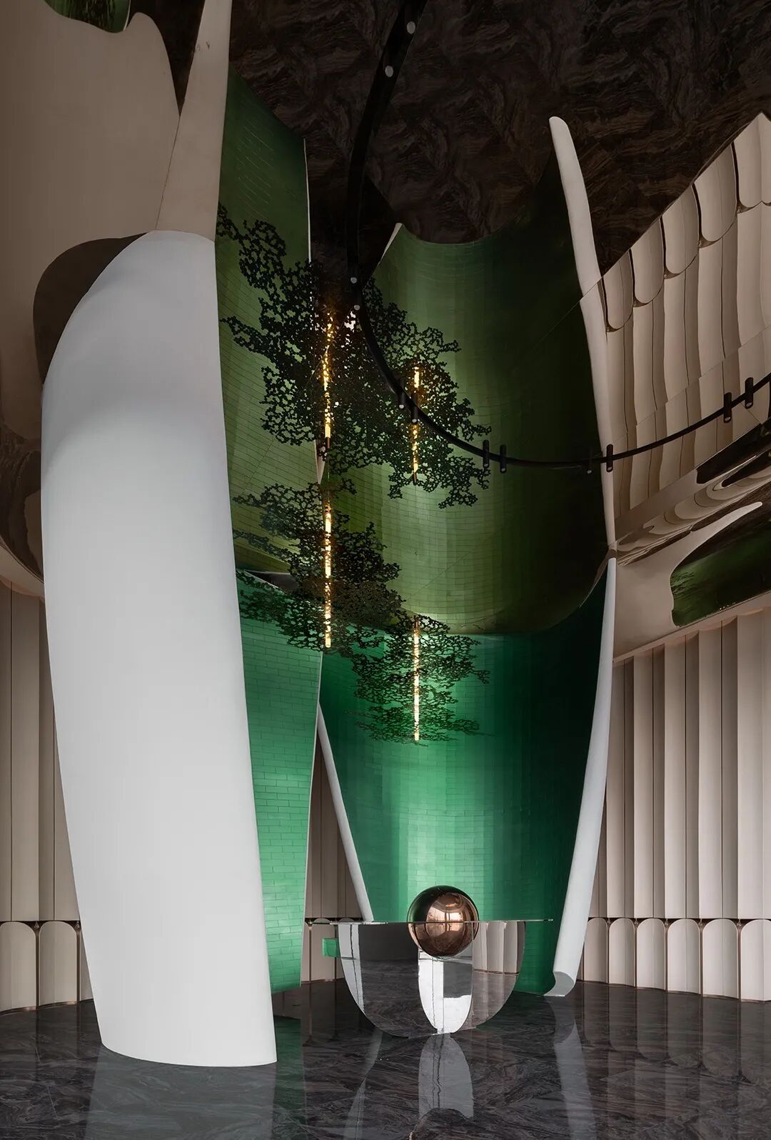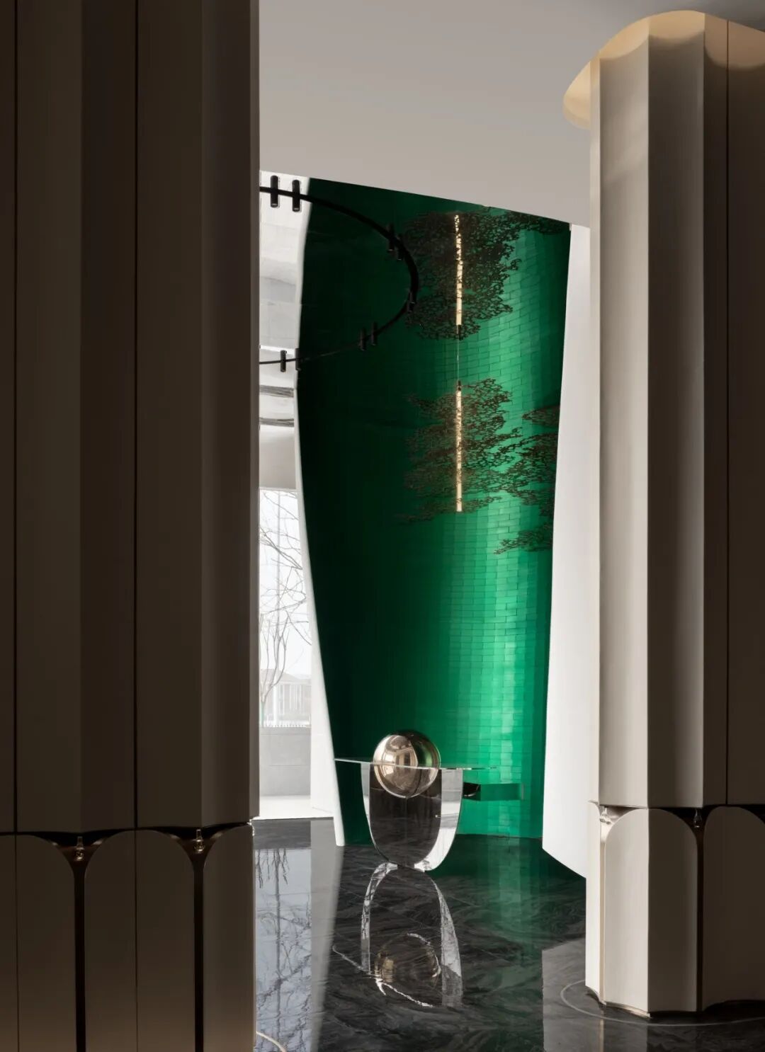空间顶部的镜面,反射出丰富的视觉层次,将艺术性的曲线融于现代风格的空间设计中,焕发生活新奇探索。