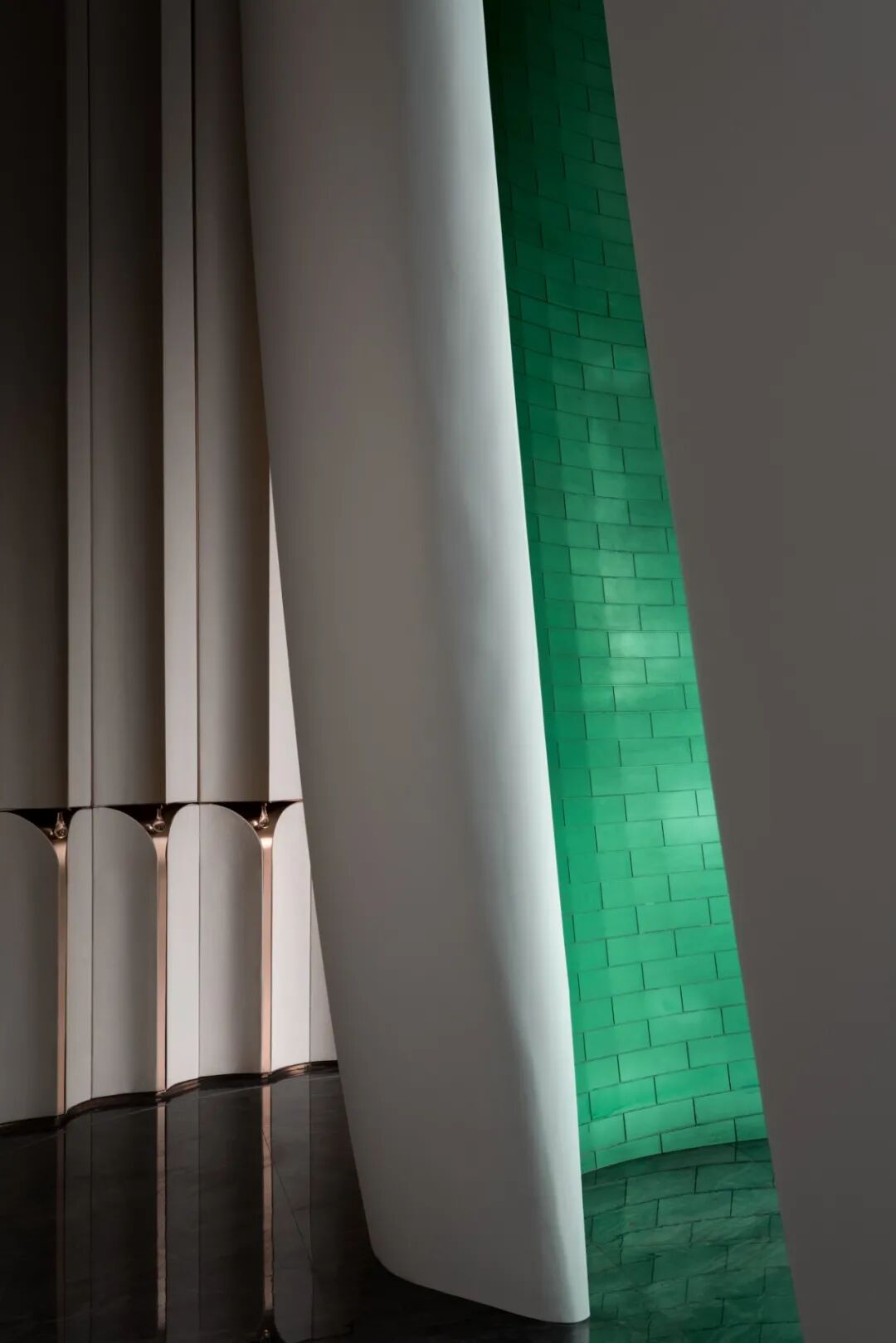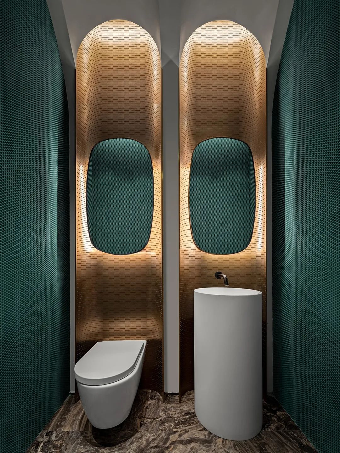 金属色泽照着灯光的缱绻,与马赛克墙面倒映出似湖泊面的平静,呈现彼此关照与对称的美。