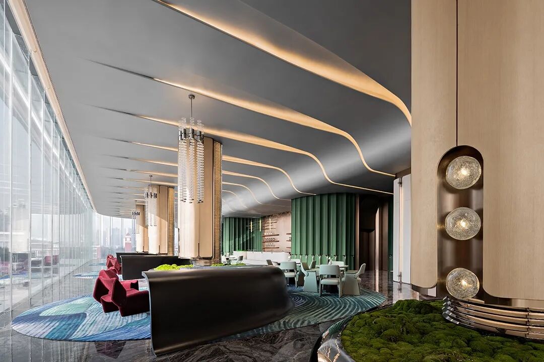 洽谈区柱体以旗袍直盘扣灯光与木饰面相组合,丰富的情绪色彩喷薄而出,显示奢贵的都市气息。