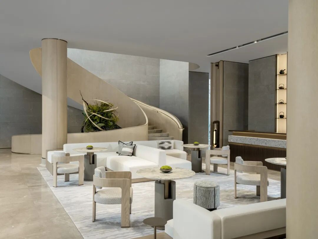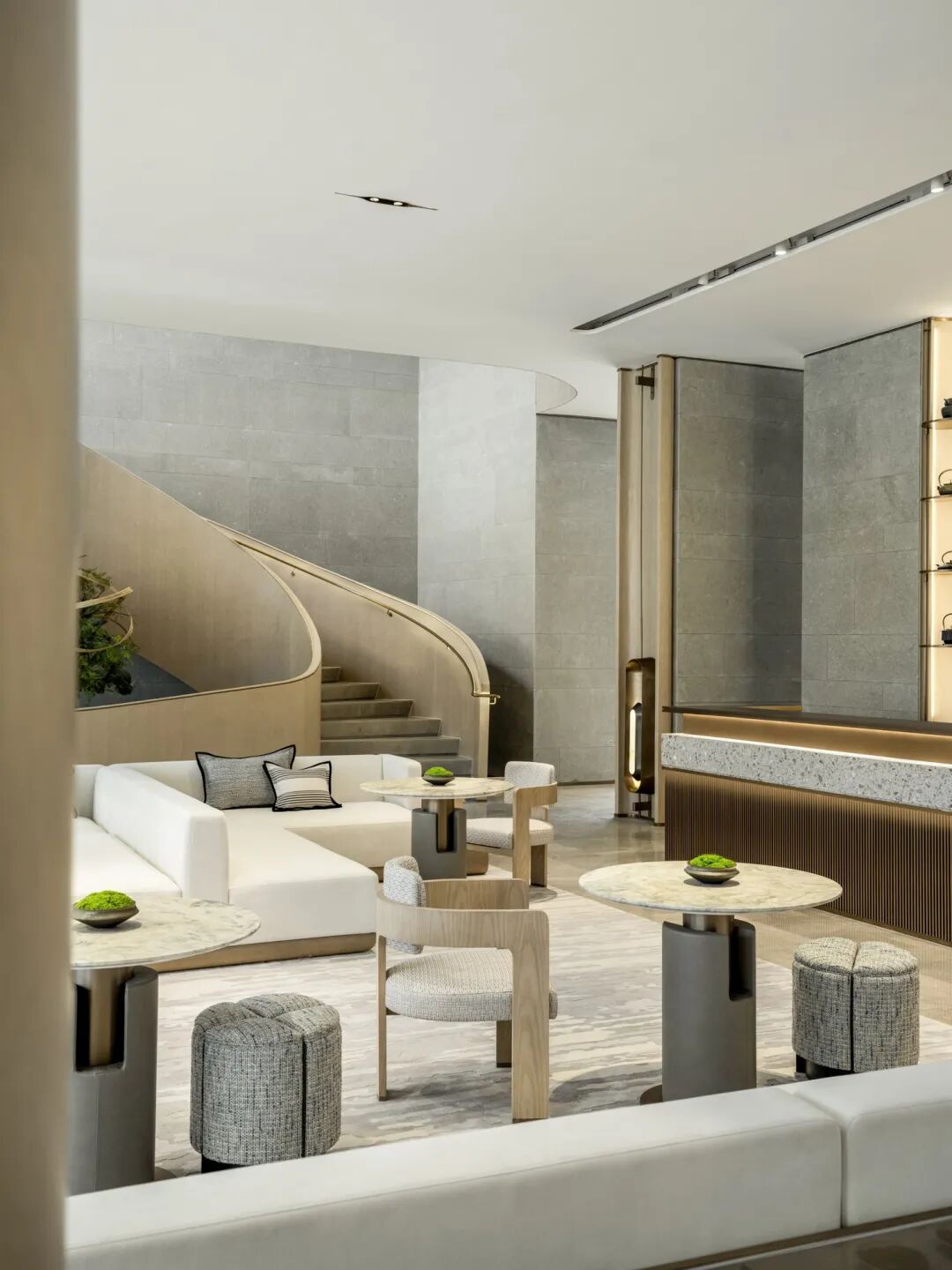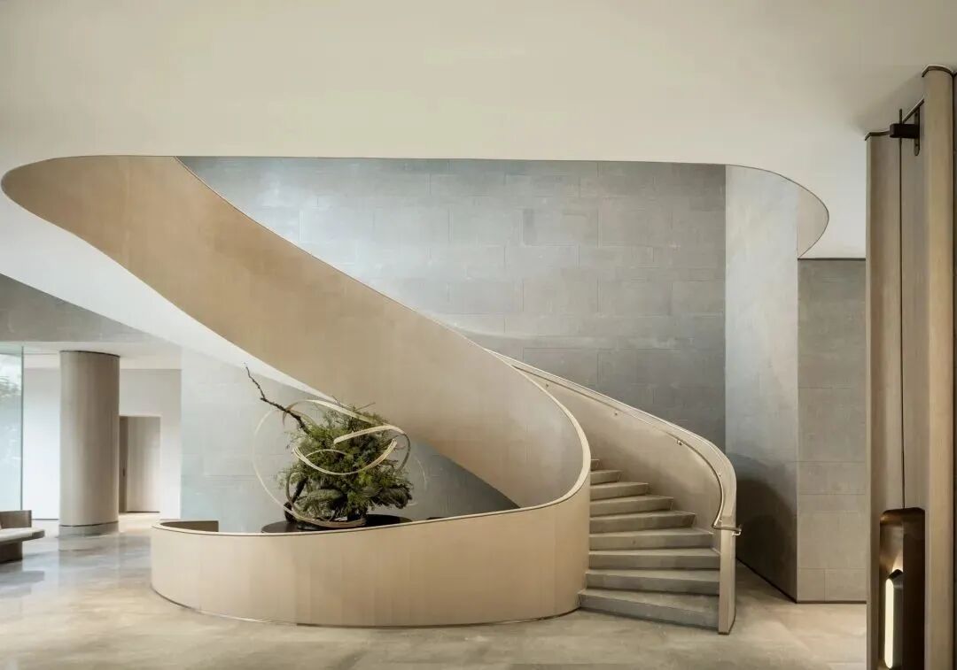 楼梯的月白之光因形体散发浪漫的质感,与金色扶手相映交织,融景于境,带来不同视角的多重观赏。