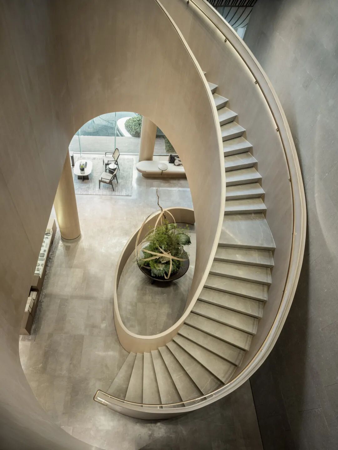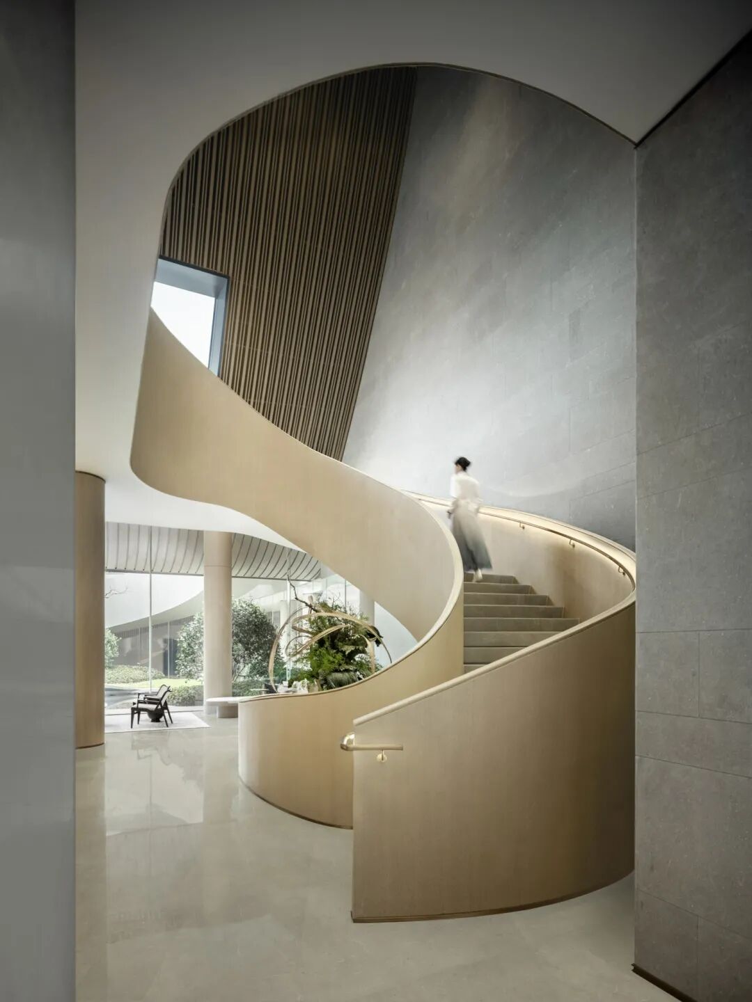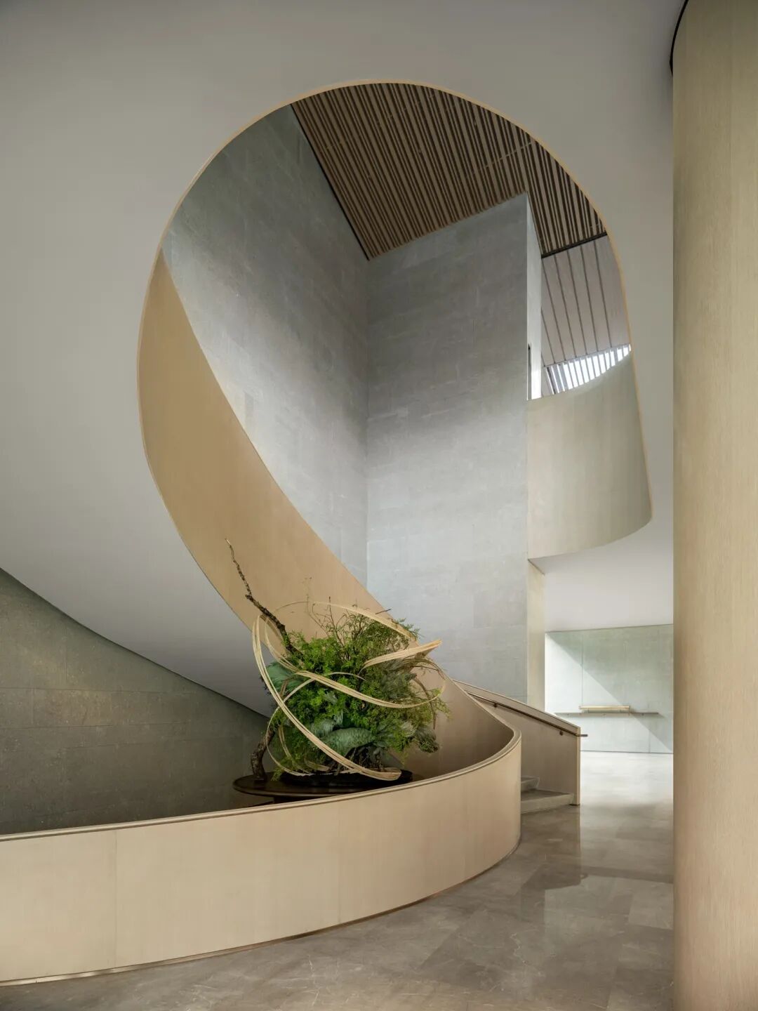 楼梯的月白之光因形体散发浪漫的质感,与金色扶手相映交织,融景于境,带来不同视角的多重观赏。