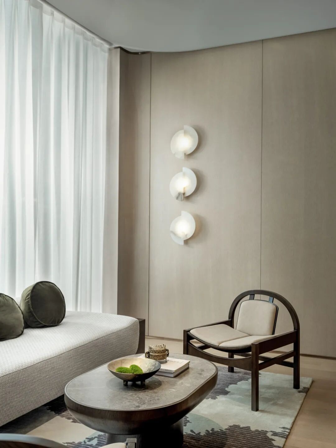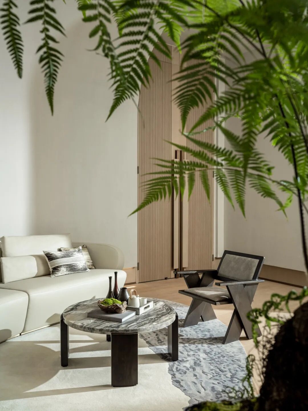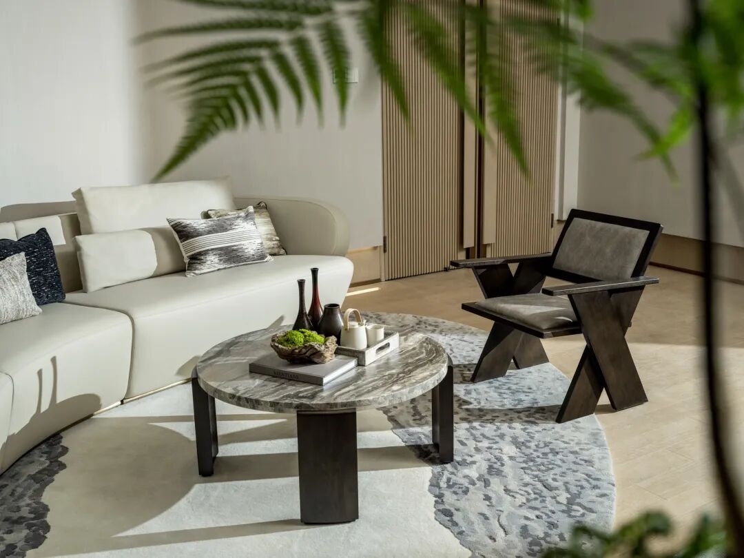 零星苔藓点缀其中,与墨绿的丝绒靠垫相衬,自然质朴的材质构筑空间的纯净,本真的美静刻此处。