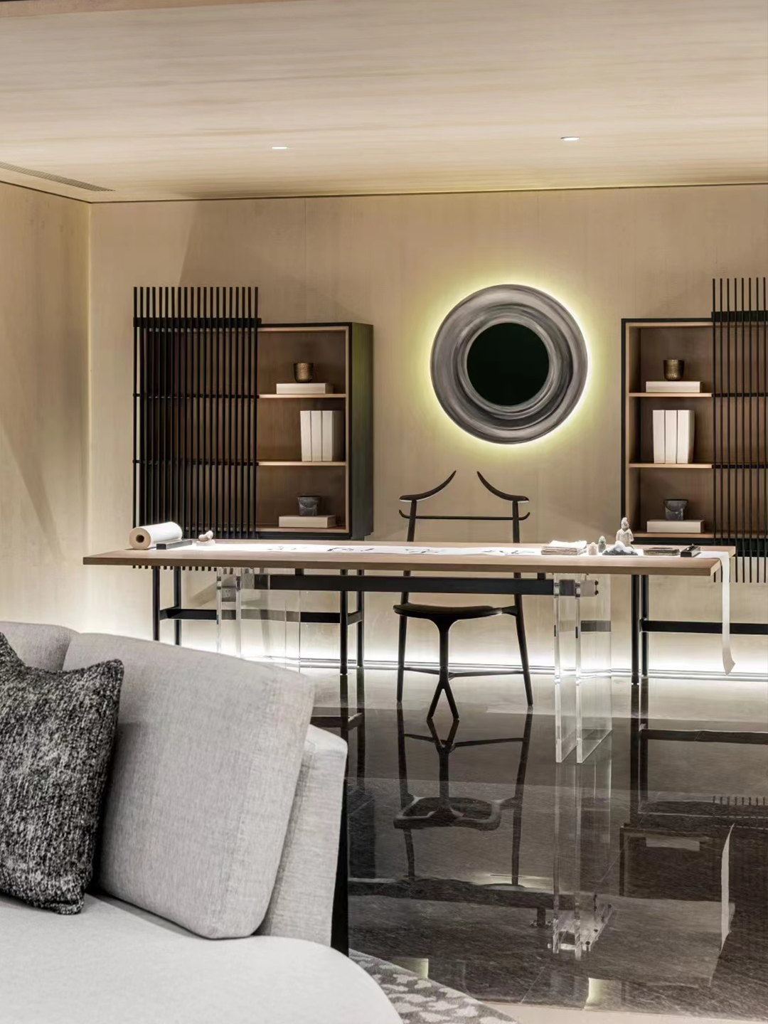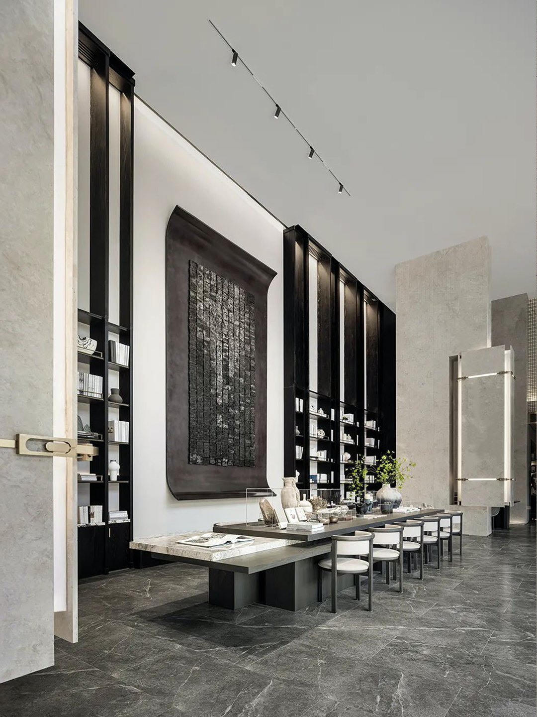 匠心书生,贤英荟萃今朝。以活字印刷为灵感的书卷于墙面展开,融合写意的审美意境。空间的诗意在水墨深浅的着色中渗透,雅致中透着坚韧的力量和浓郁的书卷气息。
