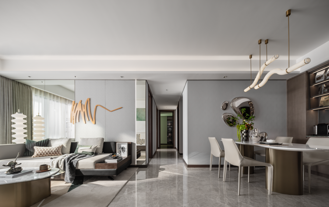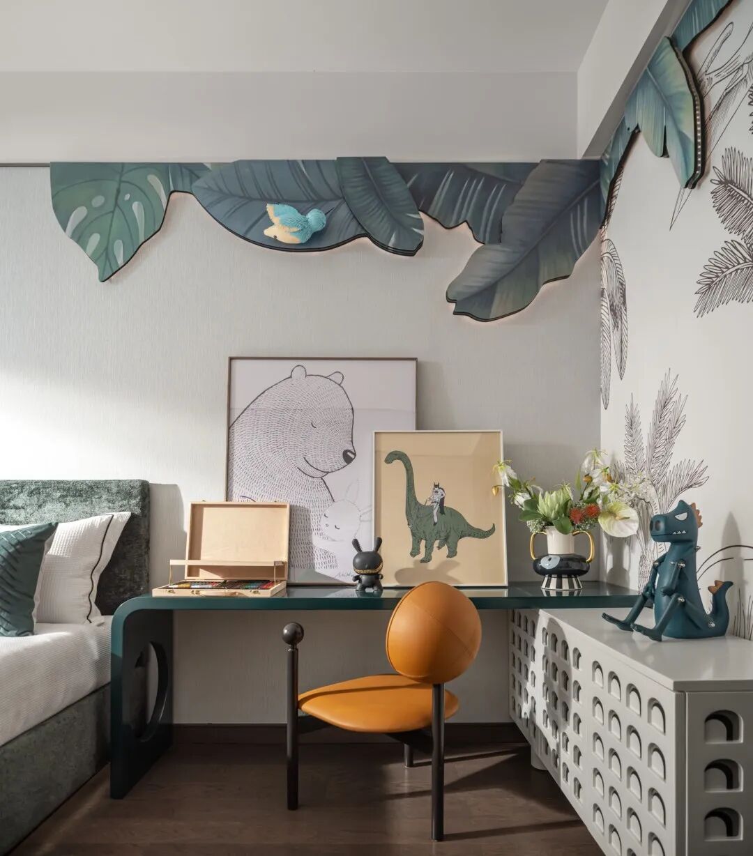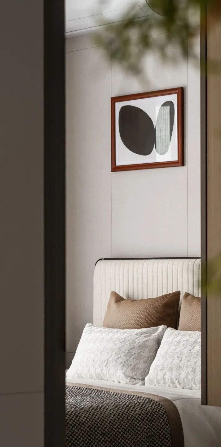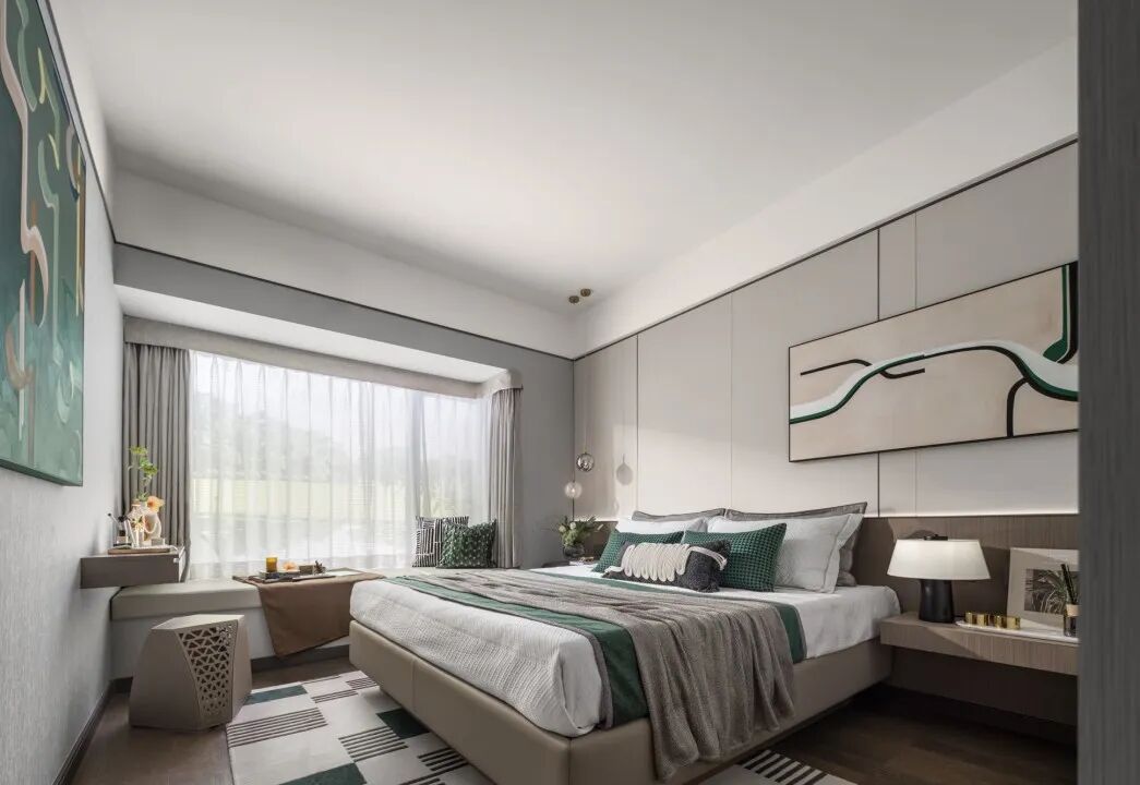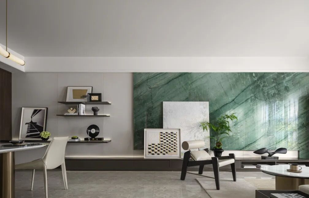 客厅以绿色作为整个空间的点睛之笔,硬装以大理石,木饰面为主要材质,增强空间的品质,同时运用艺术的形式以及淡雅轻快的调子,打造一个轻松又自然充满诗意的居住氛围。