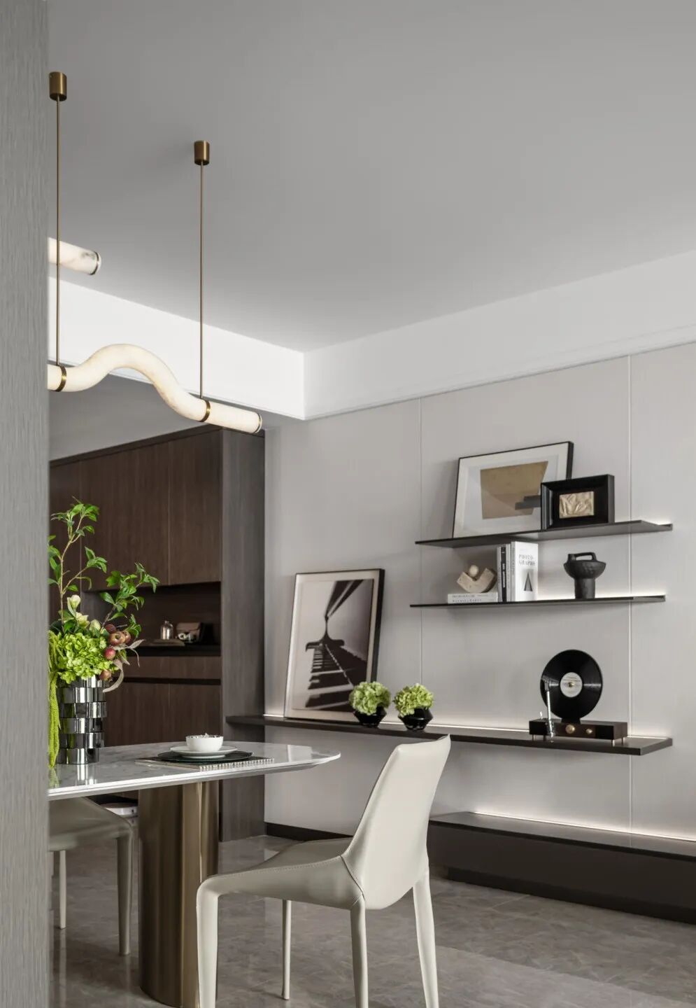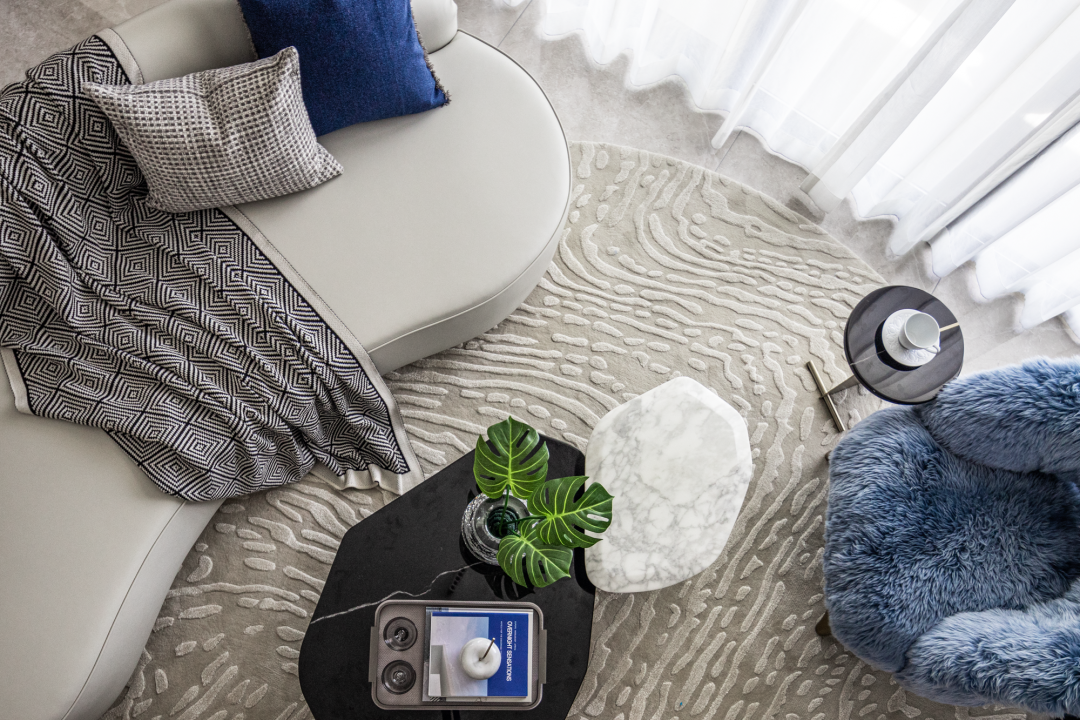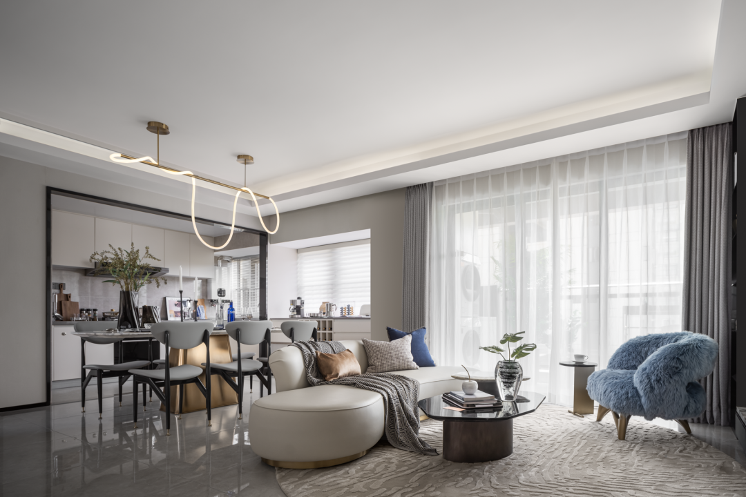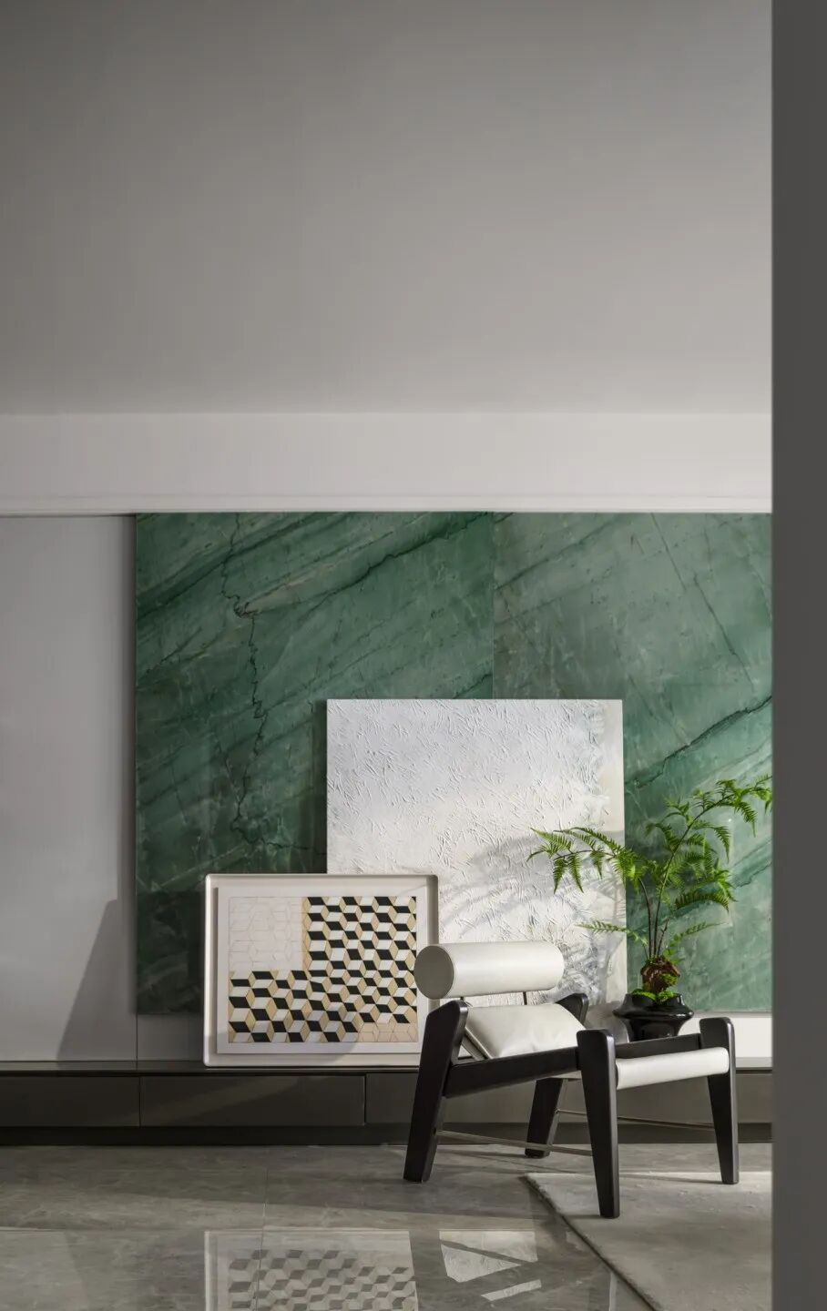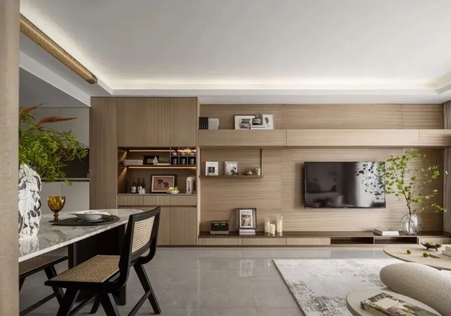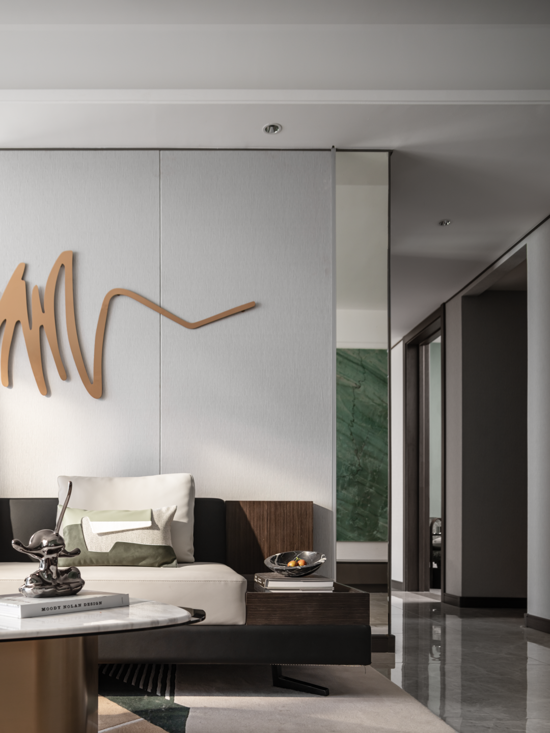 客厅以绿色作为整个空间的点睛之笔,硬装以大理石,木饰面为主要材质,增强空间的品质,同时运用艺术的形式以及淡雅轻快的调子,打造一个轻松又自然充满诗意的居住氛围。