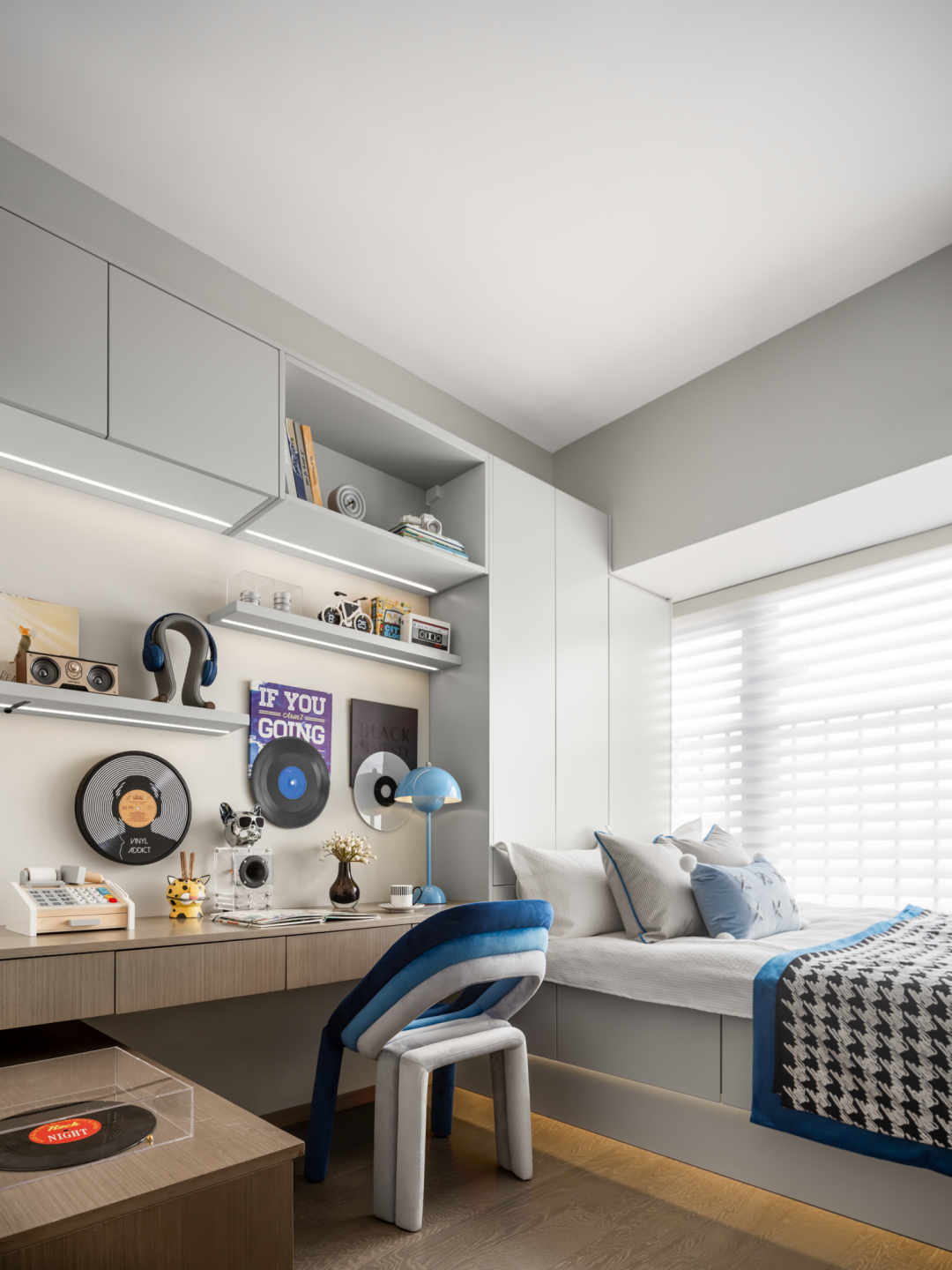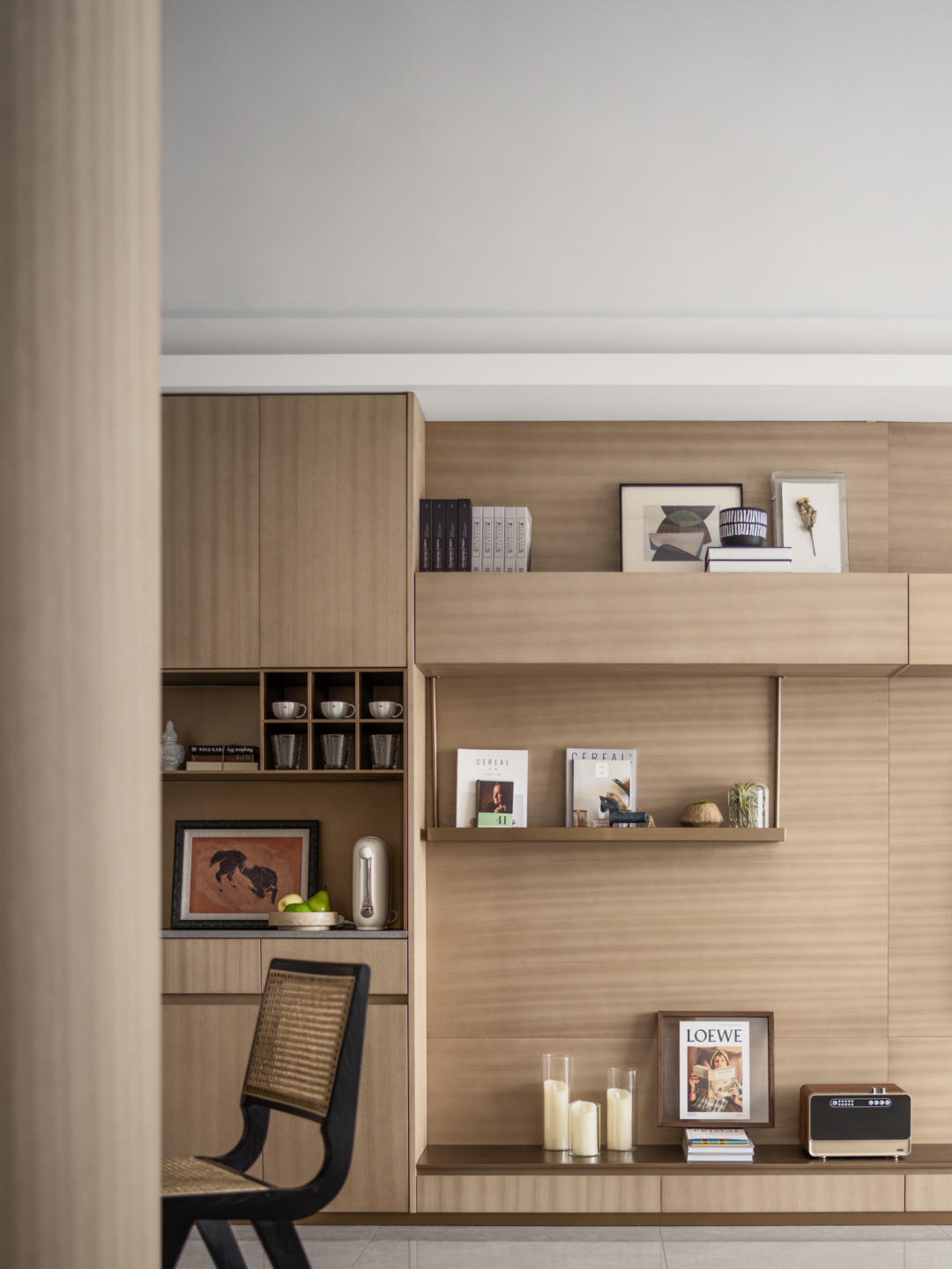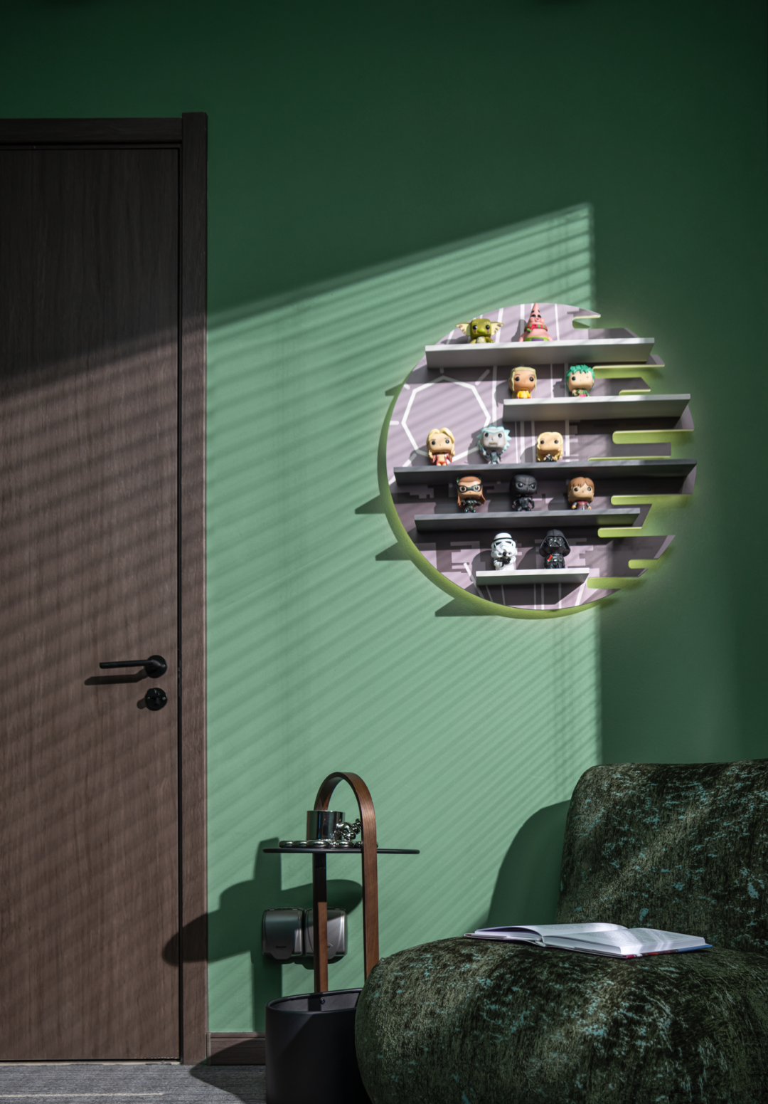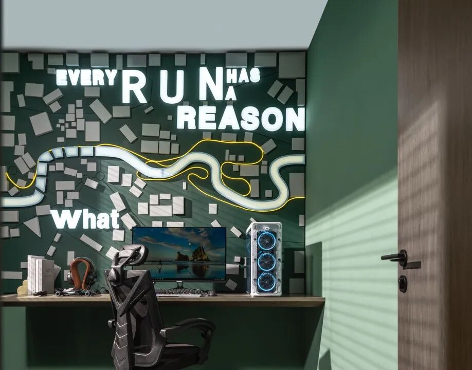 客厅以绿色作为整个空间的点睛之笔,硬装以大理石,木饰面为主要材质,增强空间的品质,同时运用艺术的形式以及淡雅轻快的调子,打造一个轻松又自然充满诗意的居住氛围。