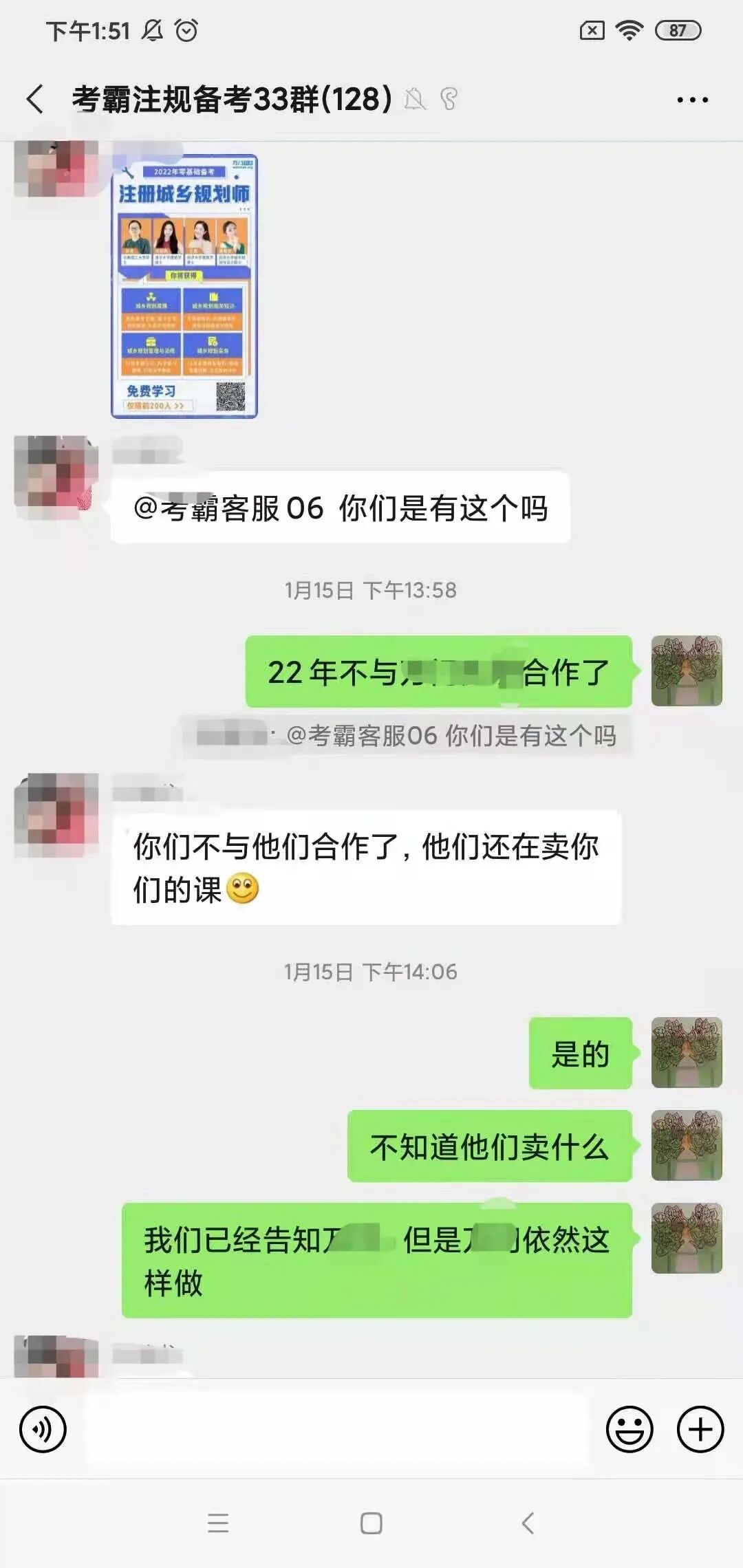 今年初大家在朋友圈看到这张海报时,W的暴雷已经在考霸团队的预判中,此前考霸的工作人员就严肃告知W方,2022年注册城乡规划师课程的合作协议尚未签订,全网发出的广告海报已经涉嫌欺骗,截止目前不知有多少小伙伴因为广告购买了W门平台21年或22年的注规课程。