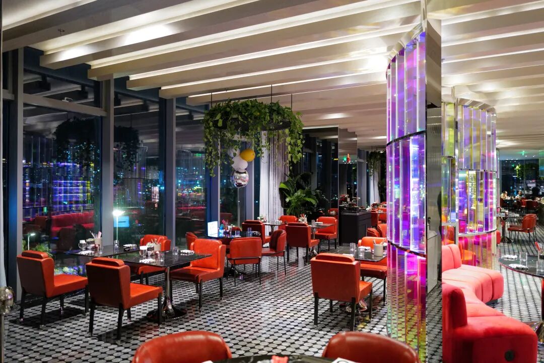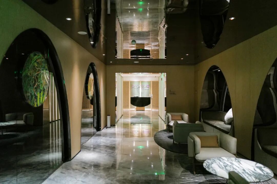 设在35层的「HEAT特色酒吧」与WET®碧波泳池共享同一个楼层,酒吧的入口“芝麻开门”后,会立马出现一条由沉浸式影像屏加持的迷宫式走廊。