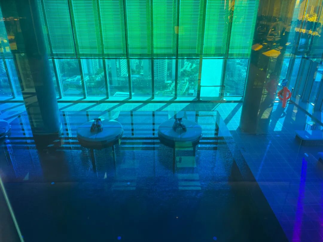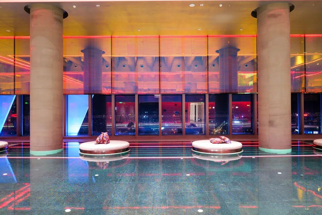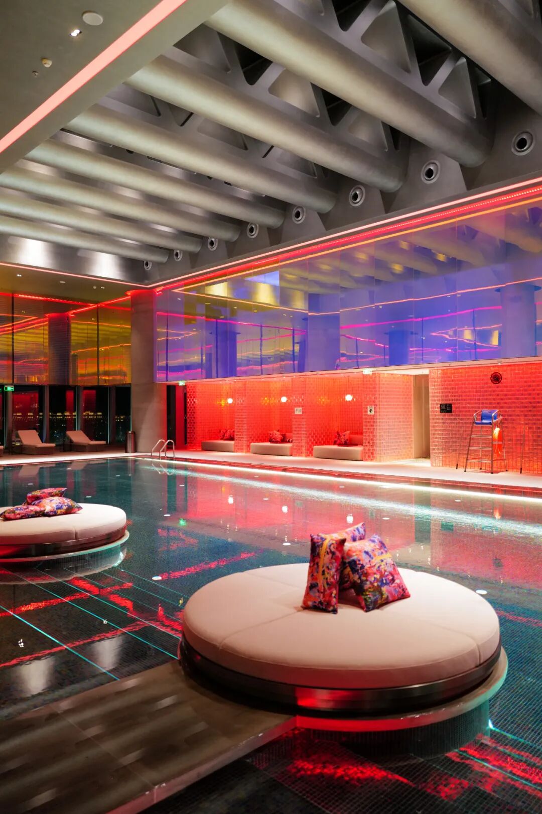 泳池还暗藏一处玄机,即泳池上空有一派霓虹色反光玻璃,实则36层健身房的玻璃墙,只能从健身房一侧才透明可见。