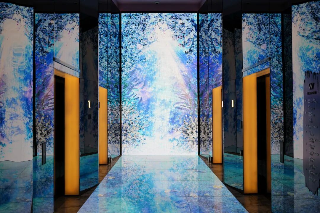 接待前厅和「潮堂」边缘还以一堵曲面墙,掩护了由日本设计公司NAKED创作的沉浸式互动艺术装置包裹的电梯厅,其具有互动效应的四季更替场景,让等电梯的过程充满了玩味,而无关枯燥。