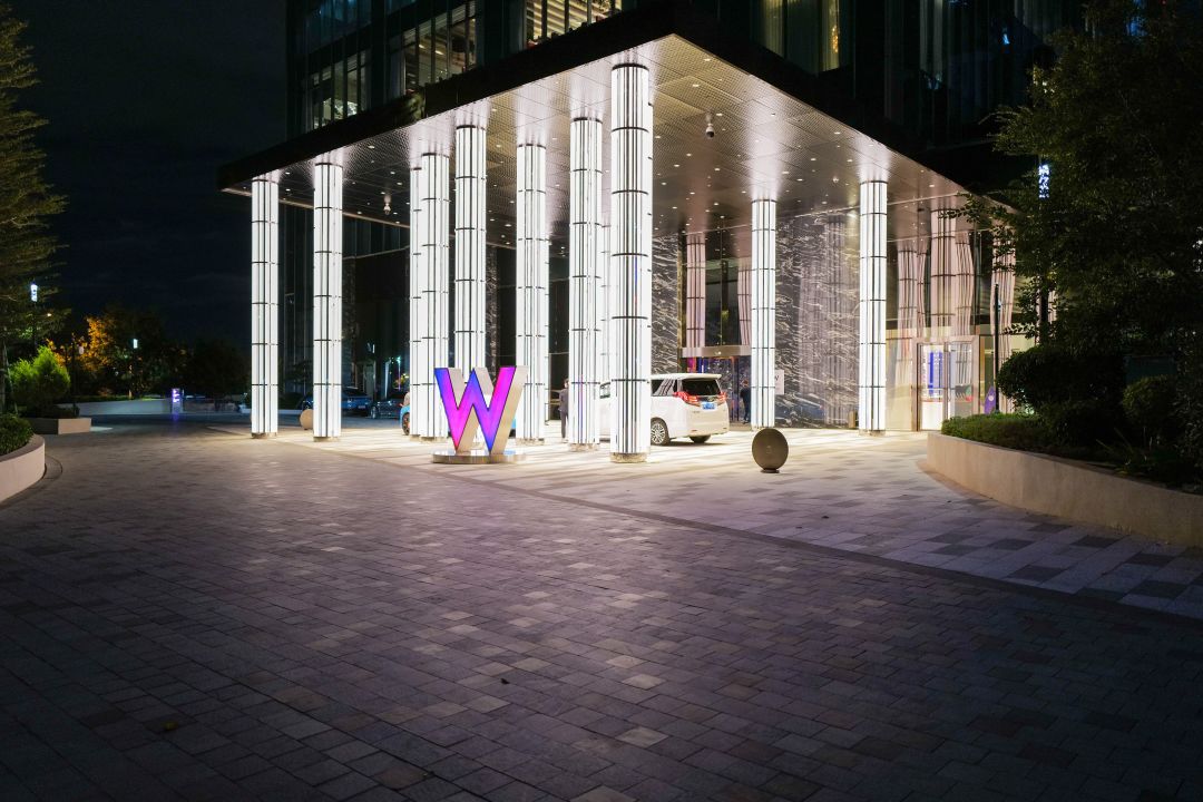每一间W在缔造前都会钦定一个明确且诗意的创作命题。厦门W酒店设定的命题是“ 流光溢彩的音乐花园”,酒店的入口运用浓密的绿意环绕。从人行道步行入店时,需要随几阶台阶穿过葱翠的绿植屏障,随后即豁然开朗,由大把晶莹立柱撑起的落客雨棚映入眼帘,与炫酷的超跑和感应门守护的入口相映成趣。