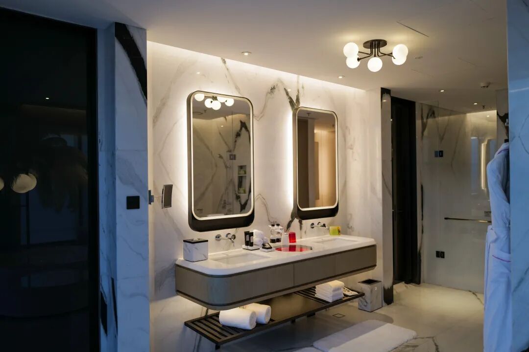 在单间客房中,插成棕榈树造型的白鹭羽毛落地灯、高仪按钮式触控板花洒、戴森吹风机全是标配。另外,淋浴间准备了一项彩蛋,在淋浴时才会闪现,本文暂不剧透。